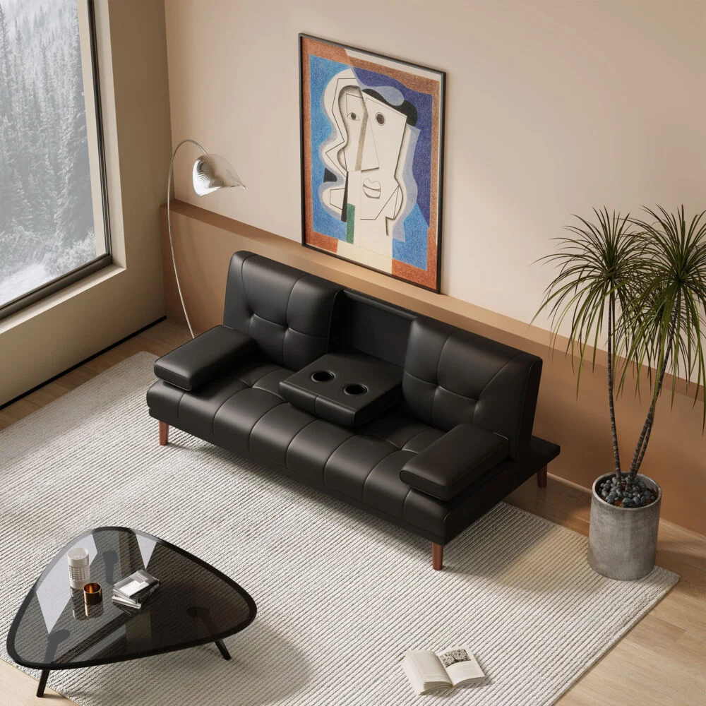 Are you still worried that there is no suitable high-quality multi-functional sofa? This is your best choice! This three seater sofa is made of soft and comfortable tech leather-look fabric, with detachable armrests and a hidden folding middle compartment, which can be freely converted into a table with two cup holders. It is not only an ideal choice for leisure time to rest, but also can provide guests with a convenient sofa bed, which is reliable and very convenient.