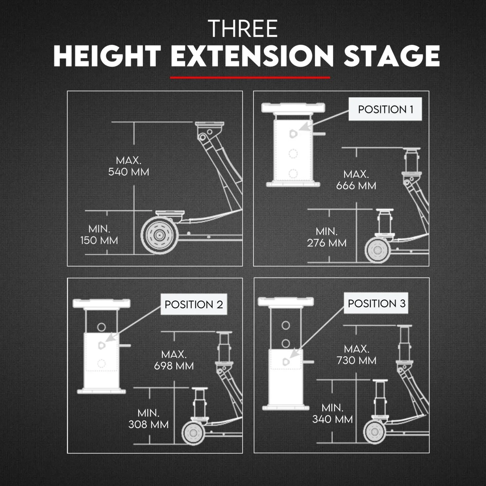 | Lift Height – Raised (No Extension) | 540 mm |