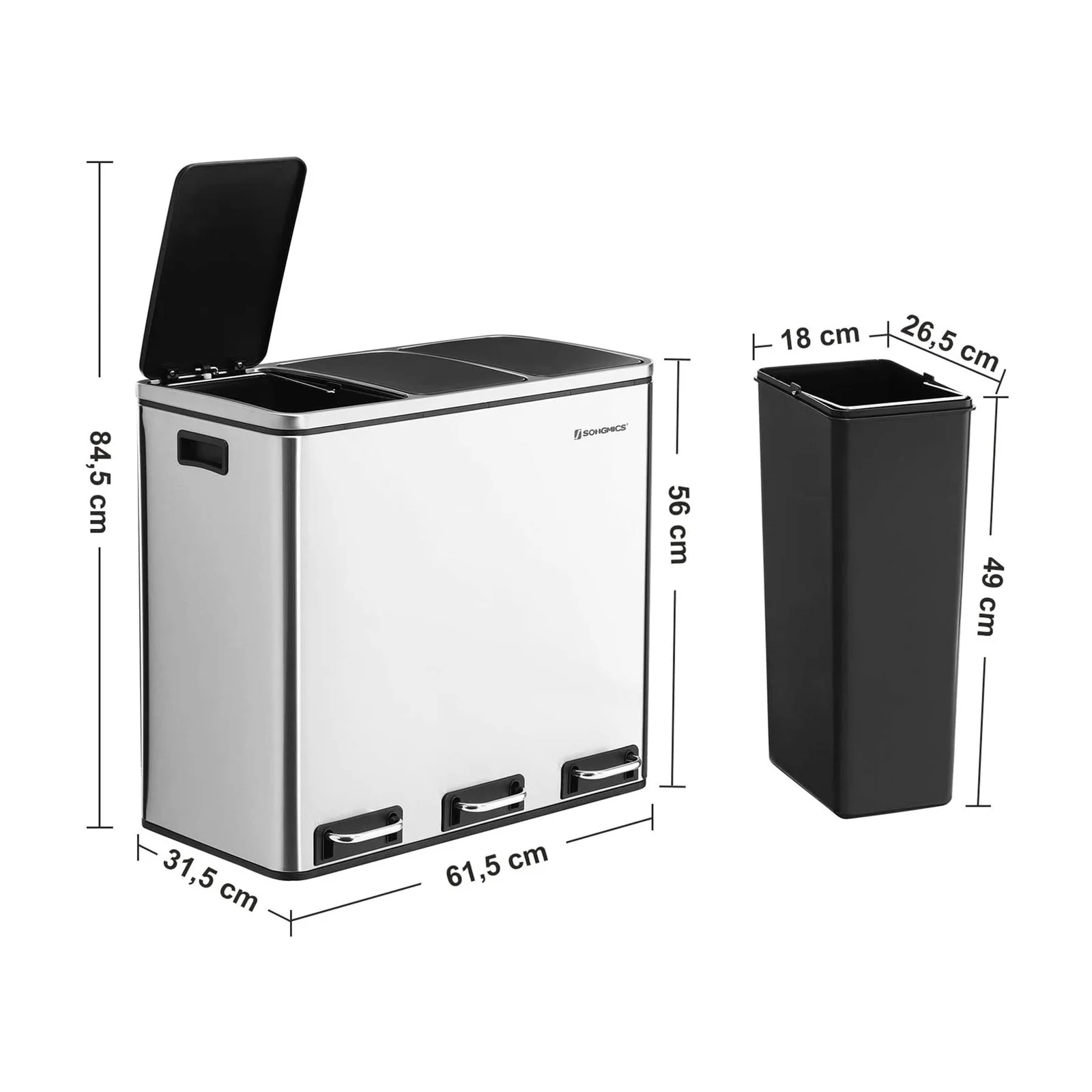 - Make separating your recycling a breeze with this sleek 3-compartment pedal bin. Enjoy the convenience of hands-free operation and the modern aesthetics of this must-have kitchen accessory.