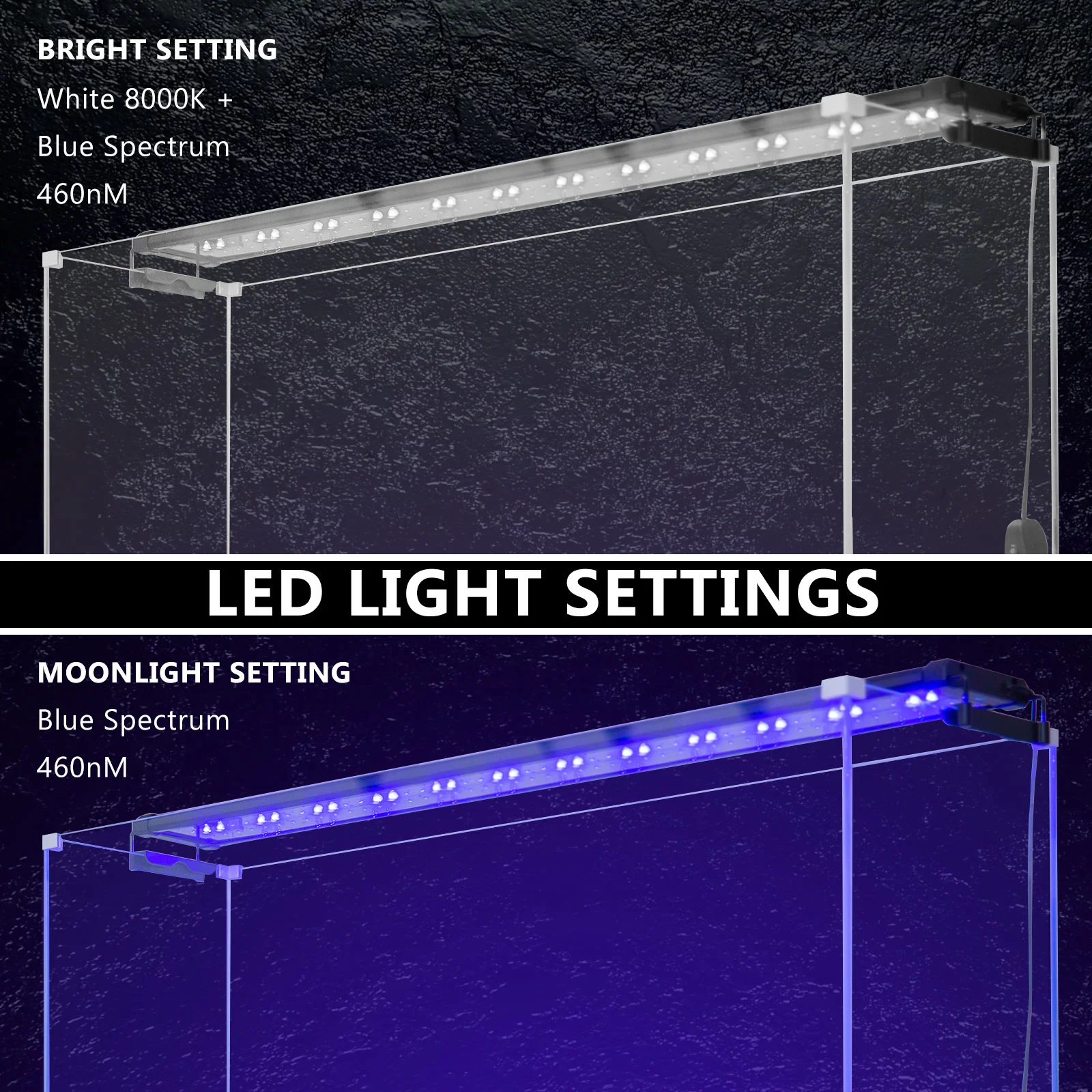 There is 2 setting on the aquarium LED. The first setting White and Blue all on. The White LED has a colour temperature of 8000K so its colour is as close as possible to the natural sunlight, which gives your fish tank an absolutely amazing and natural look. Together with the Blue LED has a colour Spectrum with 460nM, helps bring out the iridescence and blue/purple colours in your fish. The second setting is Just the Blue LED on: We called the Moonlight Setting. The blue lights not only mimic moonlight and, thus, encourage more physical activity, but these also provide them with illumination. You can also completely switch off the LED light, it's best to turn off your aquarium lights at night to mimic plants and fish natural light cycle.