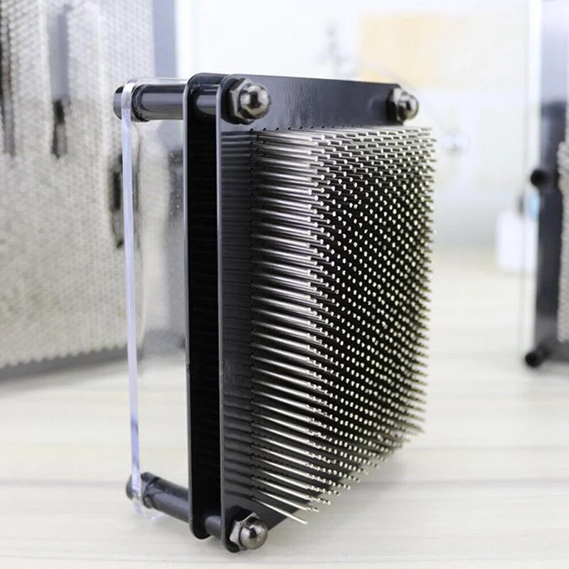 Made of silver metal pins and a sturdy black plastic frame. Features a thick clear plastic front and metal pinscreen design.