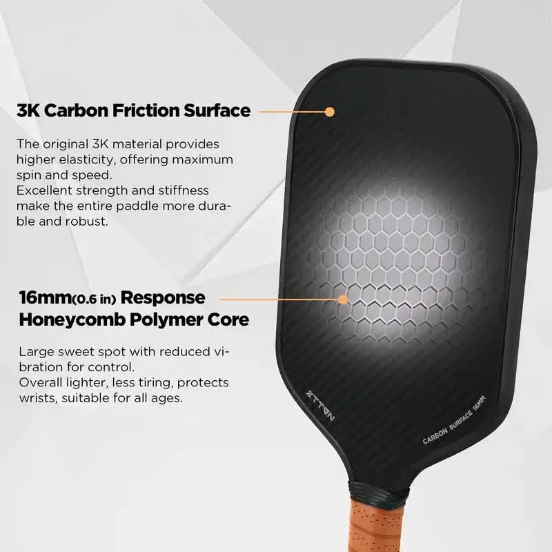Elevate your pickleball game with the premium 3K Graphite Carbon Fiber Pickleball Paddle, designed for players seeking power, precision, and superior control. Crafted with advanced materials and expert craftsmanship, this paddle is perfect for competitive, intermediate, and professional players alike. The combination of a 3K carbon fiber surface and a polypropylene honeycomb core provides optimal responsiveness, reducing vibration while offering unparalleled strength and durability.