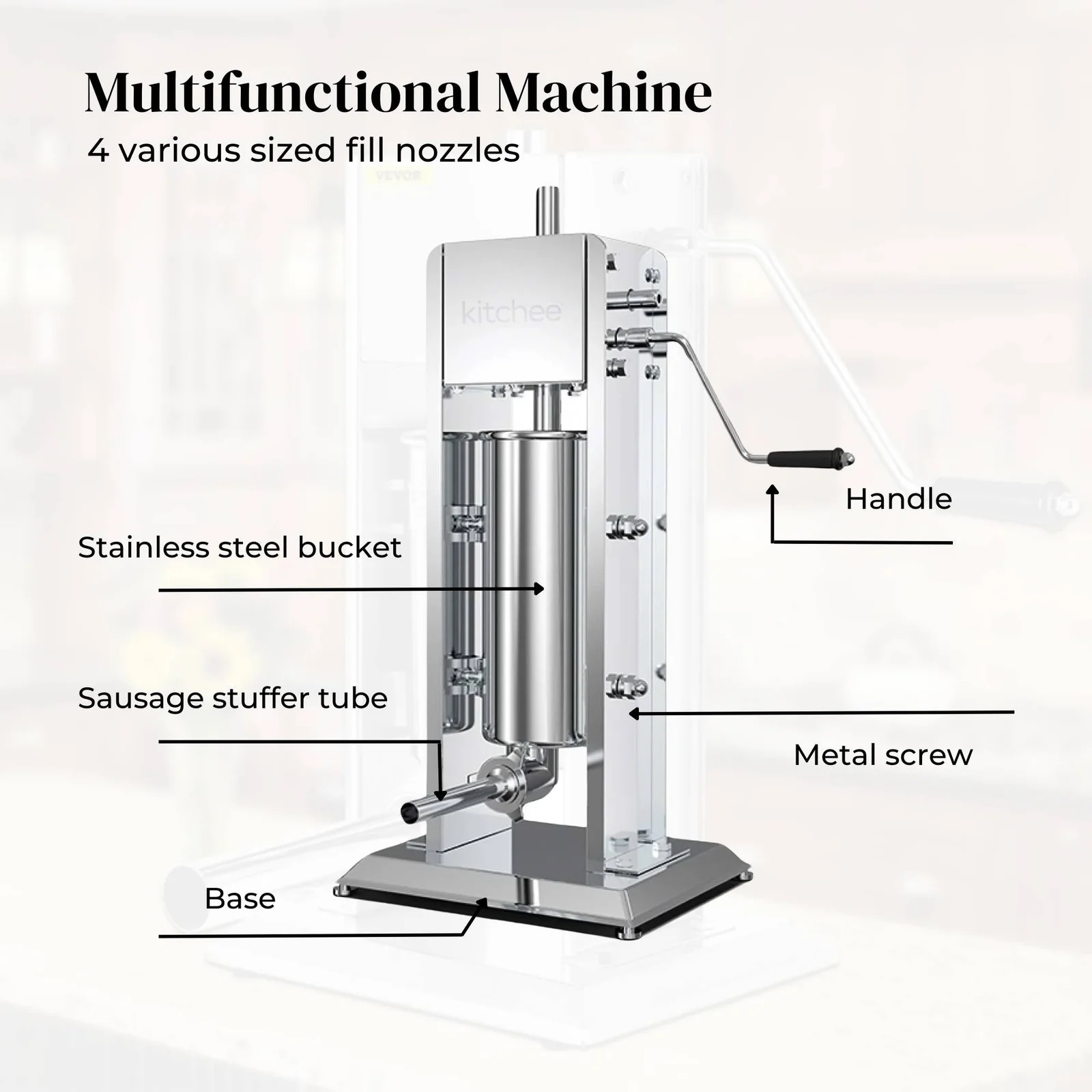 This sturdy 3L Manual Vertical Sausage Stuffer Machine is designed to be mounted securely onto any surface. The tank and various sized filling nozzles are made of a high grade, food safe 304 stainless steel for quality and durability.