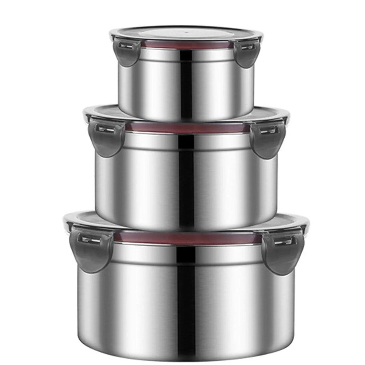 This set of round lunch boxes offers a practical and durable solution for keeping your food fresh. Made from premium 201 stainless steel, these containers are resistant to rust and corrosion, making them perfect for daily use. The lids are made of plastic with a silicone seal to provide airtight, leak-proof storage, keeping your food safe without spills. The set includes three different sizes, ideal for various food portions. These versatile lunch boxes are stackable to save space in your kitchen or fridge, and they are microwave, oven, and dishwasher safe. The containers are approximately 3mm thick for extra durability.