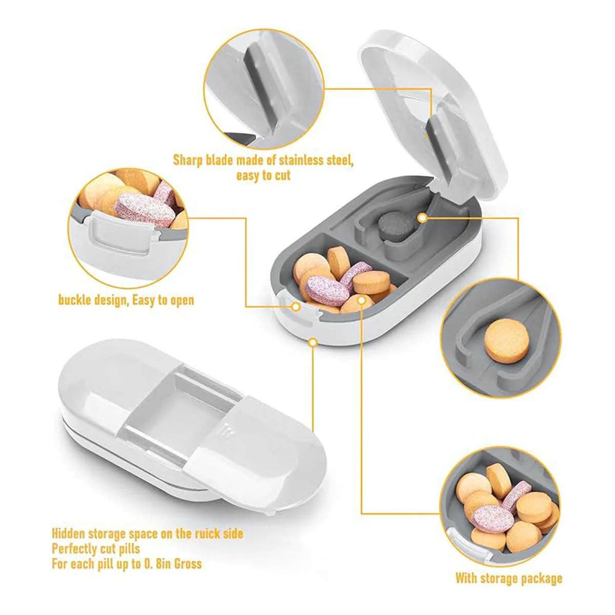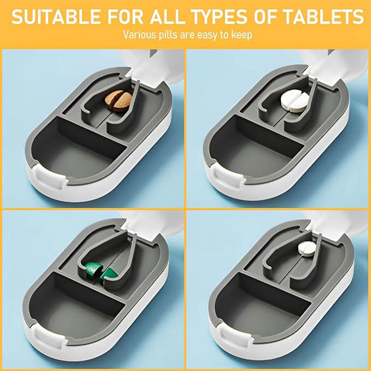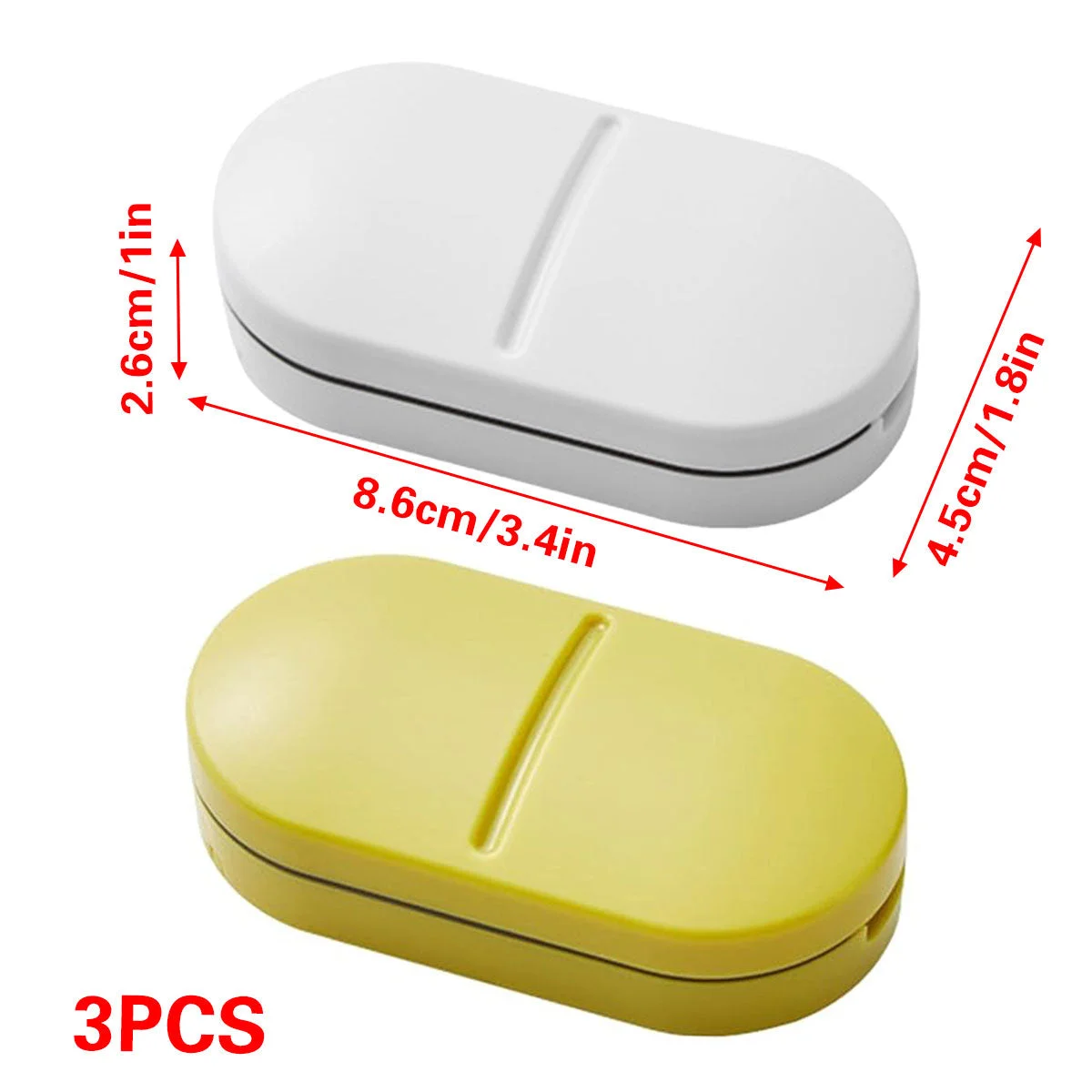 Manage your daily medication with ease using this 3-piece compact tablet cutter and pill organiser. Designed for convenience and portability, each unit features a precision stainless steel blade for clean tablet splitting and internal compartments for storing pills. The soft silicone base holds tablets securely during cutting, while the ABS outer casing offers durability for everyday use. Ideal for travel or home, this all-in-one solution combines pill division and organisation in a sleek, lightweight design available in white or yellow.