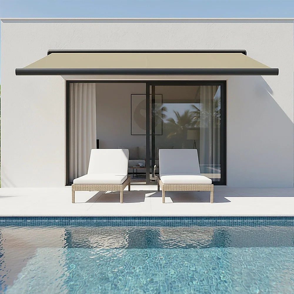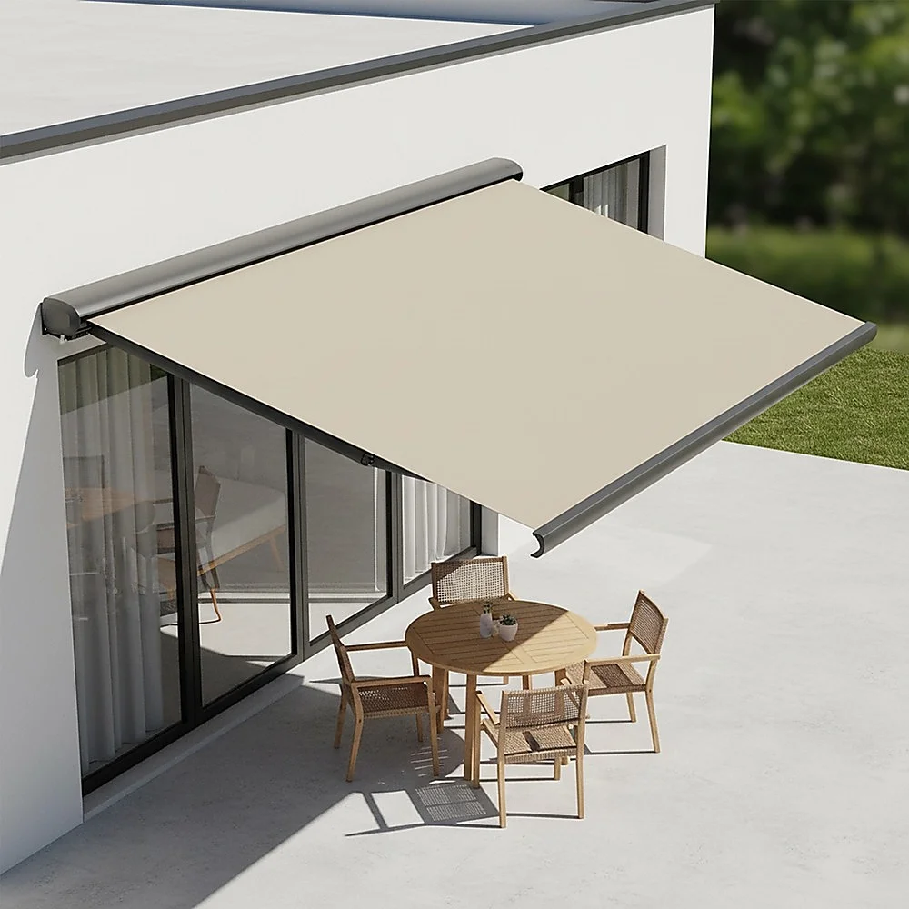 Bariloche retractable awnings are operated by wireless remote control (included) with a powerful 50 Nm tubular motor hidden within the roller tube.