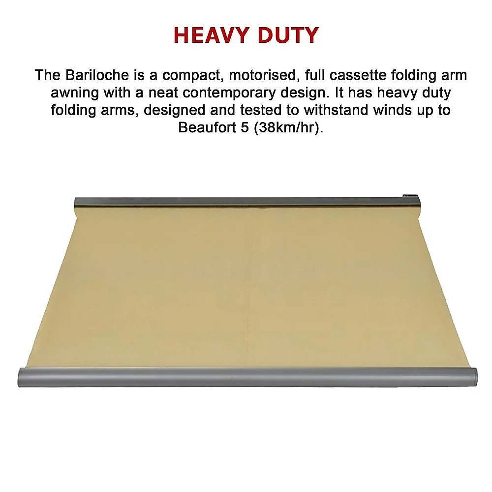 The Bariloche is a compact, motorised, full cassette folding arm awning with a neat contemporary design. It has heavy duty folding arms, designed and tested to withstand winds up to Beaufort 5 (38km/hr).