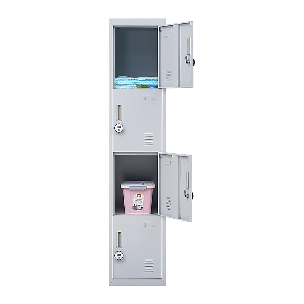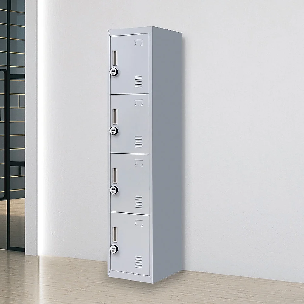 Four vertically-stacked lockers provide a good amount of room for small personal belongings, purses, textbooks, office supplies, and much more. This comes comes with 4-digit combination lock to ensure safety of your items.