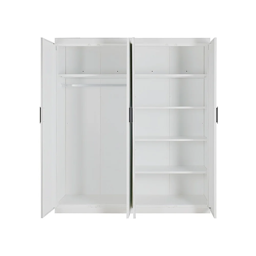Upgrade your bedroom with this 4 Door White Wardrobe, a stylish and functional storage solution crafted from durable steel plates. Finished with powder coating and accented with black metal handles, this wardrobe brings modern elegance and long-lasting performance to any space.