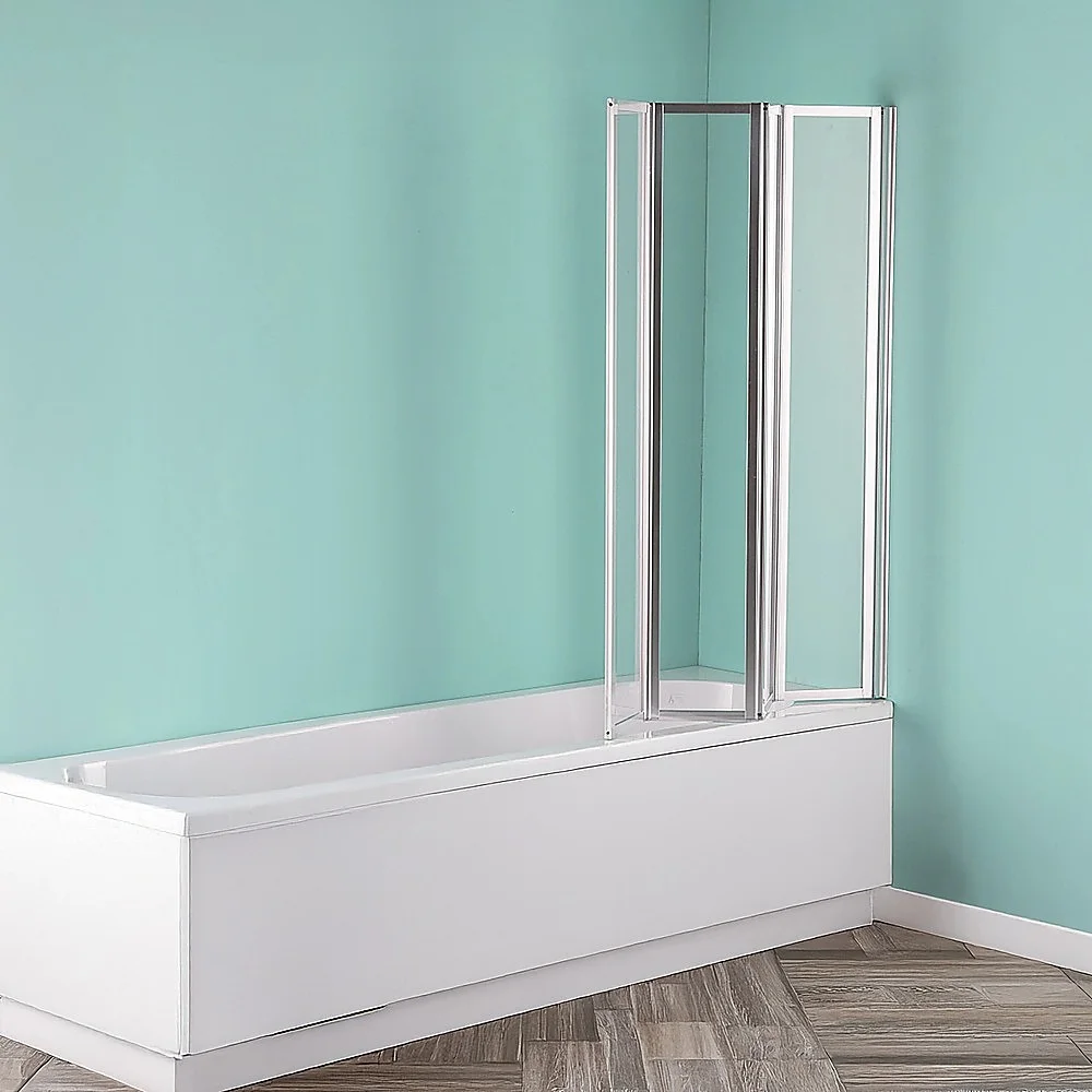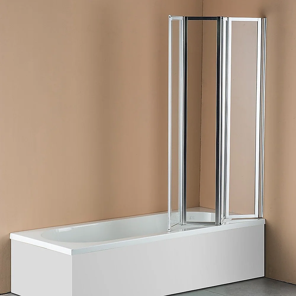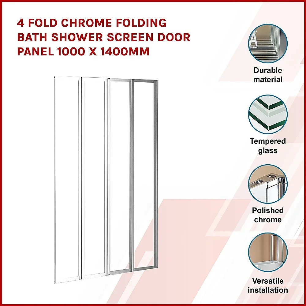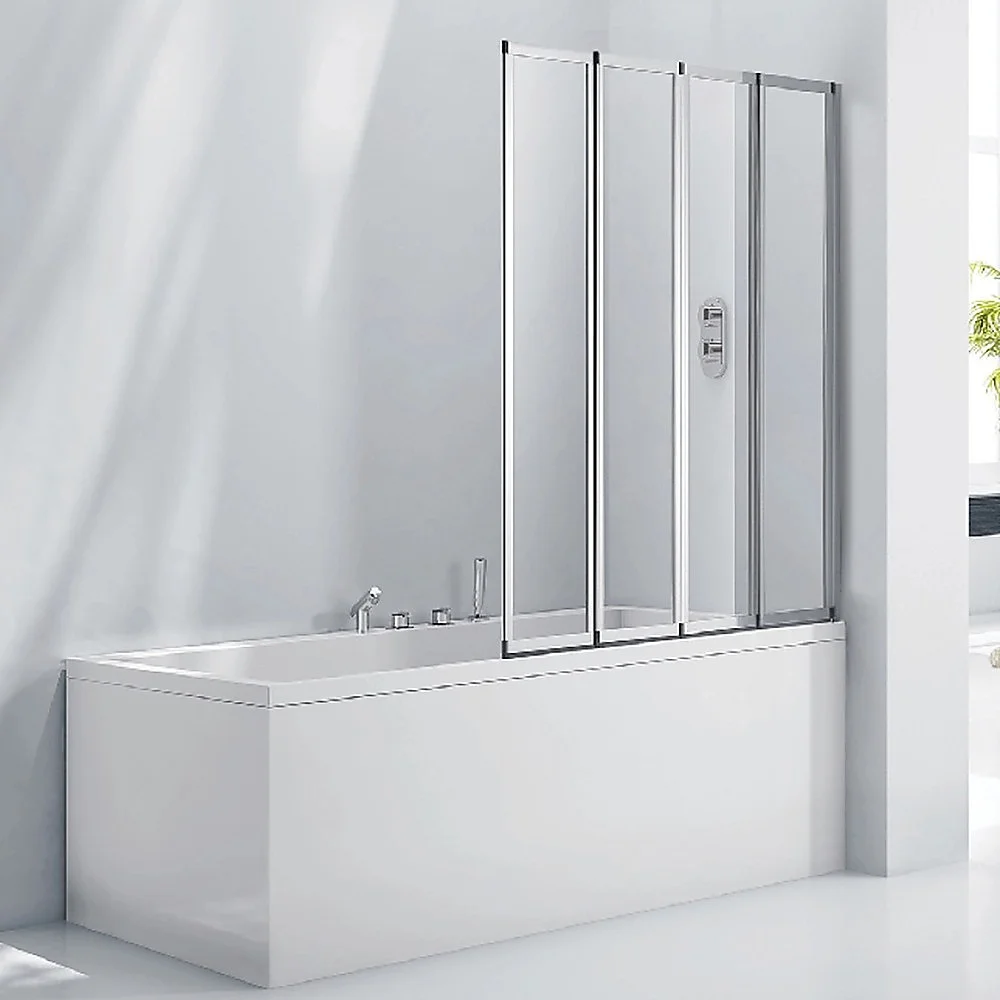 Our four-fold chrome bath shower door panel will brighten your existing bathroom or be a welcome improvement as a part of your bathroom renovation. This folding shower screen is a plus for both the homeowner and the home developer. The panel's frame is constructed of the highest quality polished chrome and the AS/NZS 2208 approved glass ensures safety and reliability.
