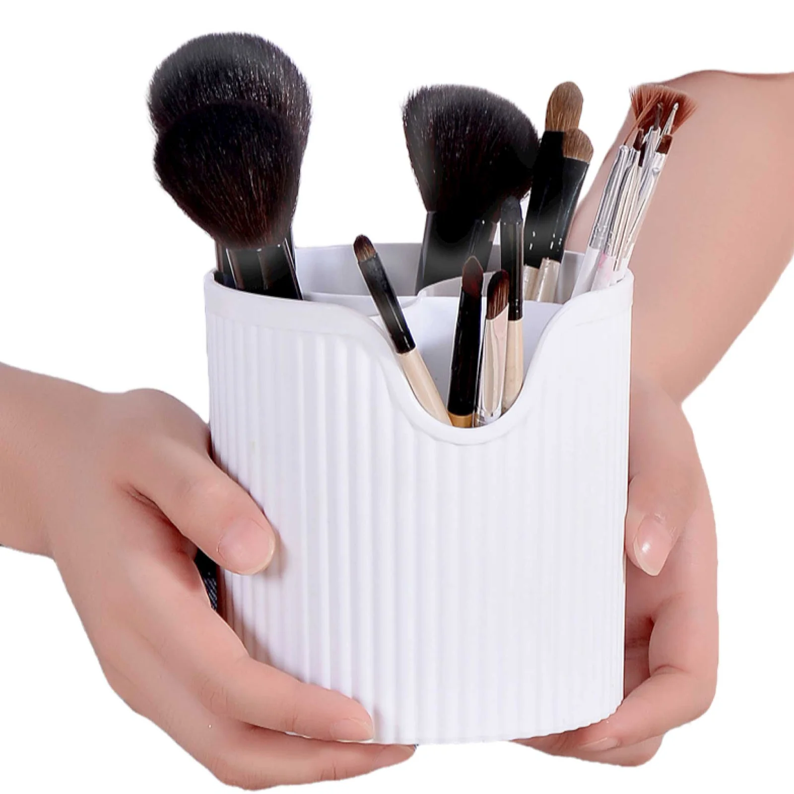Keep your vanity or bathroom tidy with this 4 slot makeup brush organiser. Coloured in a sleek, stylish white with a rippled effect on the outside, this storage tin is great for anyone who wants to organise their collection and keep their brushes and other cosmetic tools together and in order.