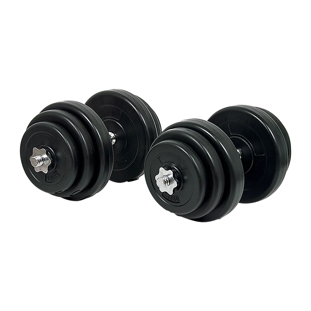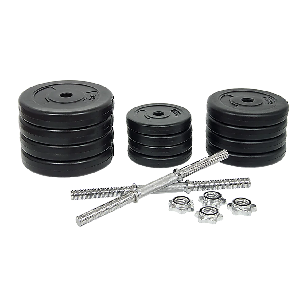 The set comes with twelve plastic-coated cement plates in small increments, so you can increase your load gradually as you build your strength. Star-shaped nuts made from high-quality steel keep the weights in place for easy lifting.