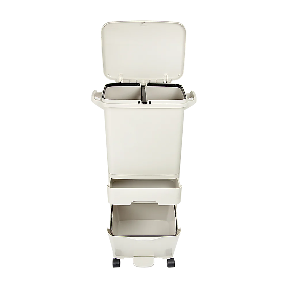 More than just a rubbish bin — or even a recycling bin — this 42-litre combination waste disposal system from Randy & Travis Machinery features two main compartments and a bonus drawer in the middle. That's not all. The top compartment has two sections, allowing you to divide compostable rubbish from paper waste. Side hooks allow you to easily hang bags for filling. Use the middle storage drawer to stash liners, ties, or other supplies, while the bottom compartment opens up at a 45-degree angle to store recyclables. When you're ready to take it out for recycling, simply lift it out and carry it by its handle. With wheels that turn a full 360 degrees in all directions, it's easy to move.