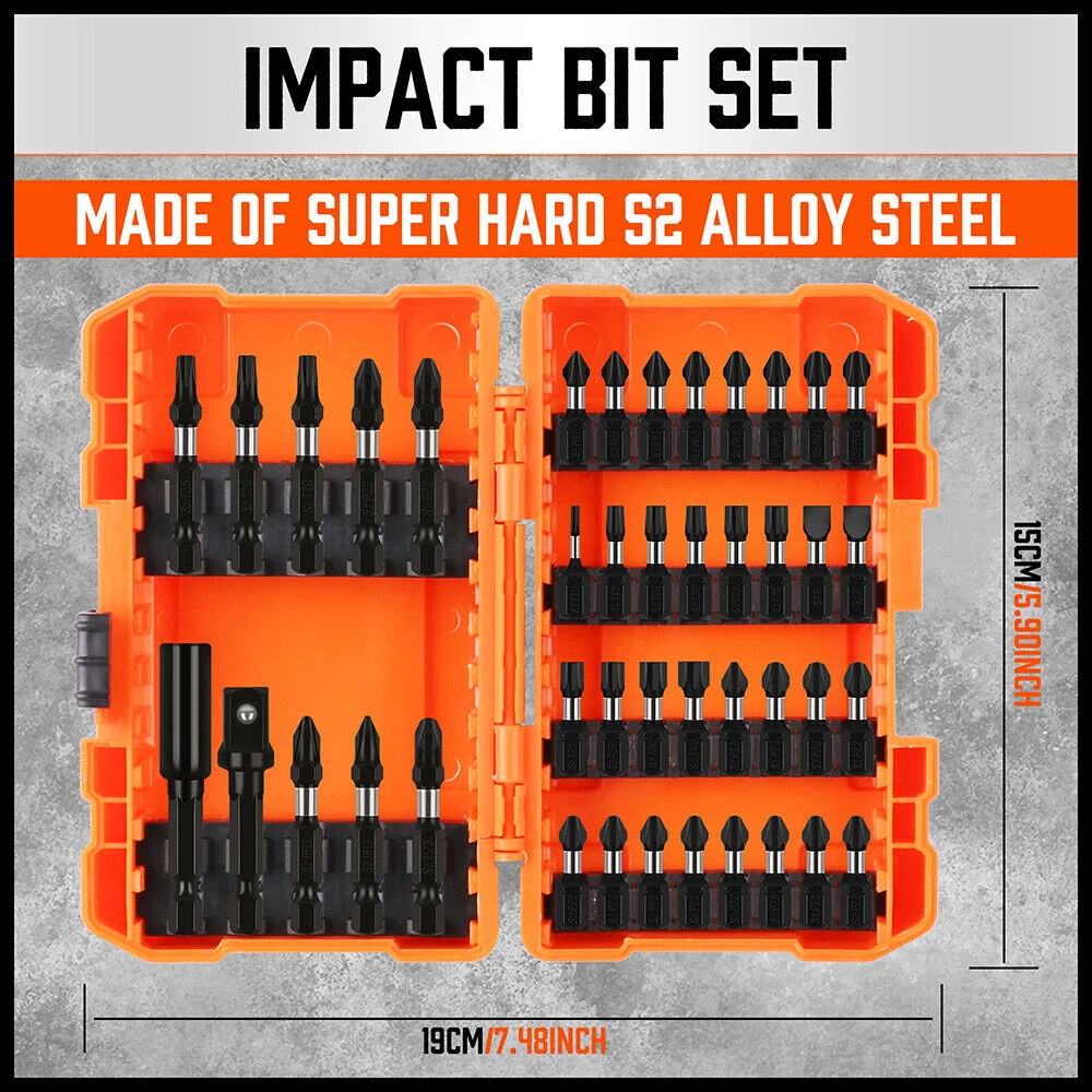 【Complete 40+1+1 Tool Set】40 impact screwdriver bits, 1 magnetic bit holder, 1 socket drill adaptor. Complete combination for most driving and fastening jobs.