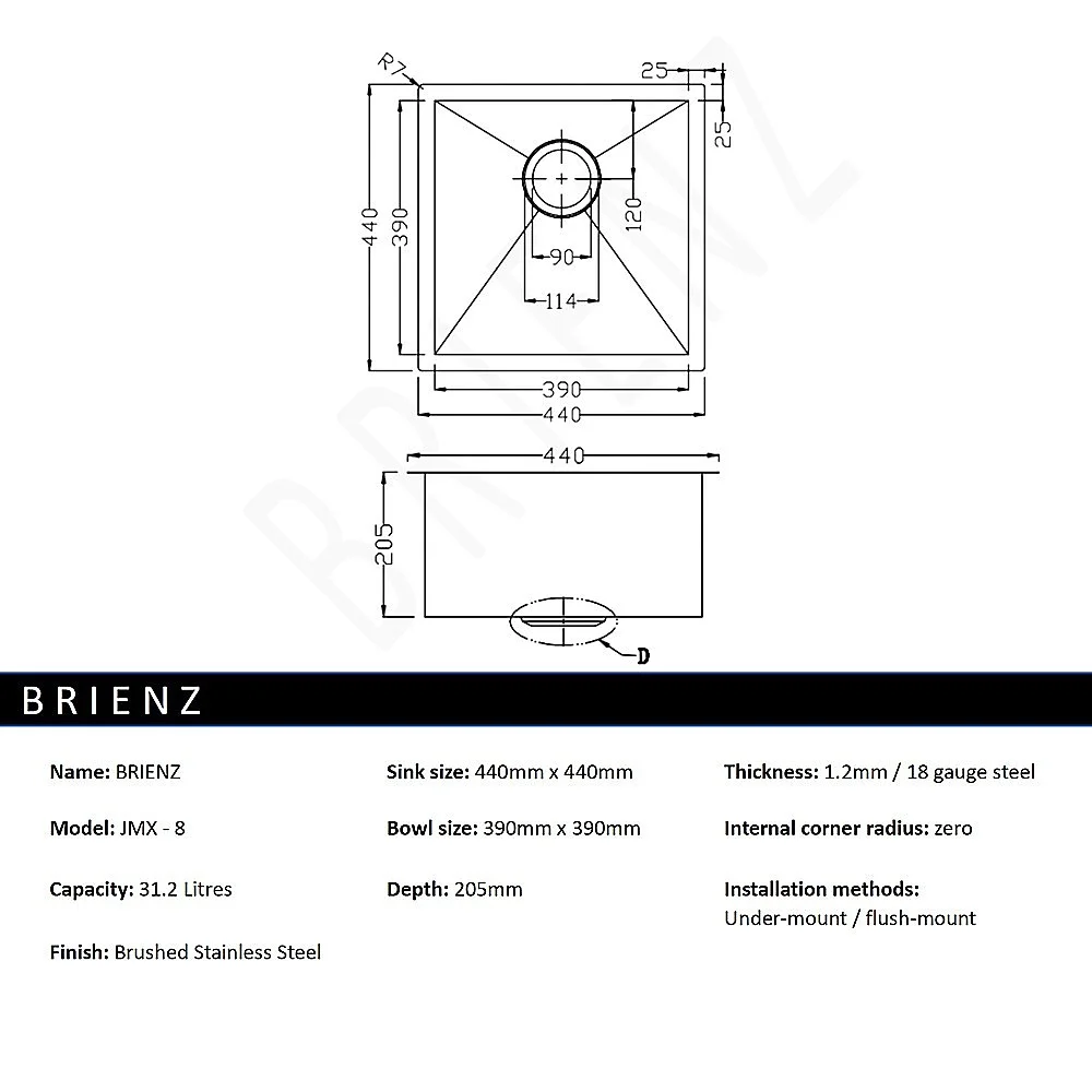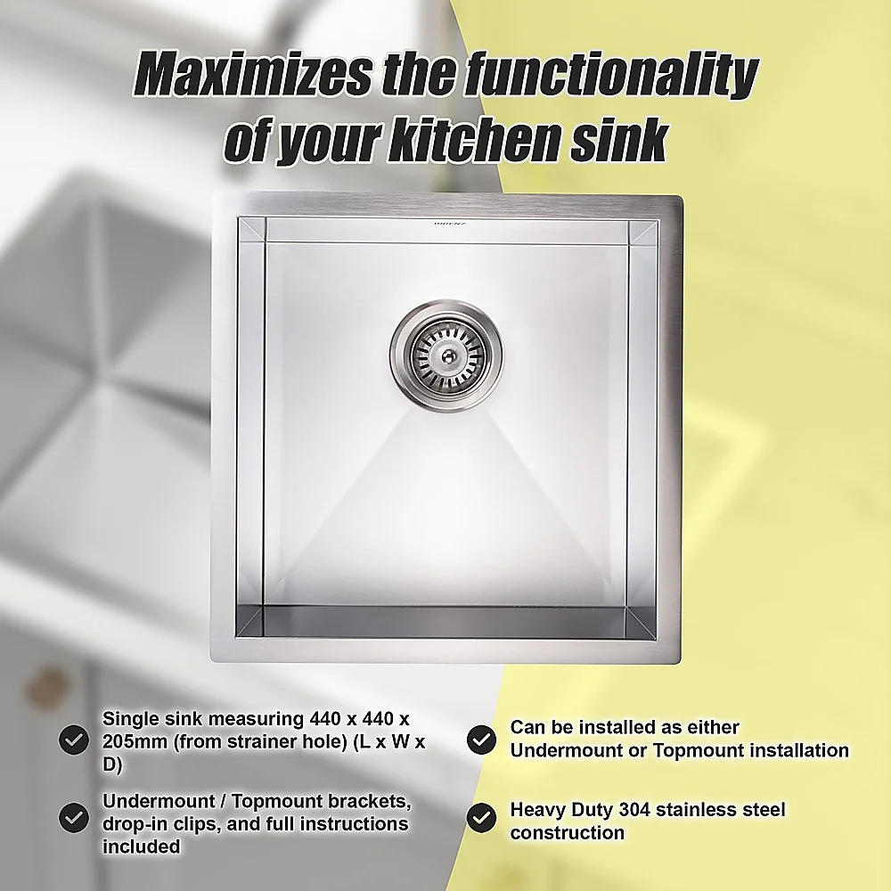 This single sink is made from hand-made 1.2mm-thick Type 304 stainless steel for a brilliant look that will last and last. It measures 440 x 440 x 205mm (L x W x D) with a 90mm drain opening and an above-average depth for added versatility. A strainer waste is included. Installation is either Undermount / Topmount-style. Undermount / Topmount brackets are included along with full installation instructions.