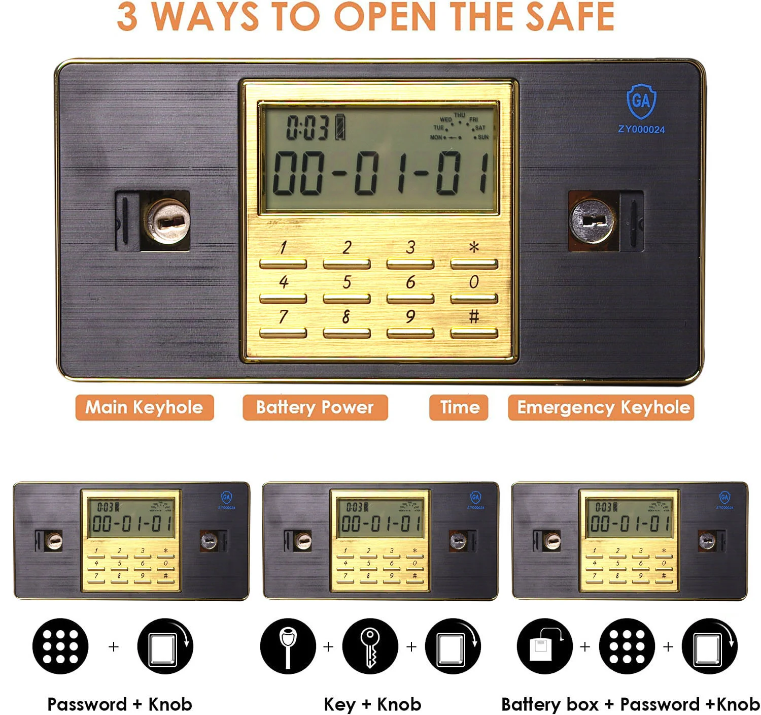 After the battery is installed, the screen displays "time, week and date". When the battery is low, the screen will display "LO-BATTE" to remind you to replace the battery. There are three ways to open the door. Dual key or 1-8 digit password or Emergency battery pack to power supply + 1-8 digit password. NOTE: Please do not put double keys or external battery box in your safe box
