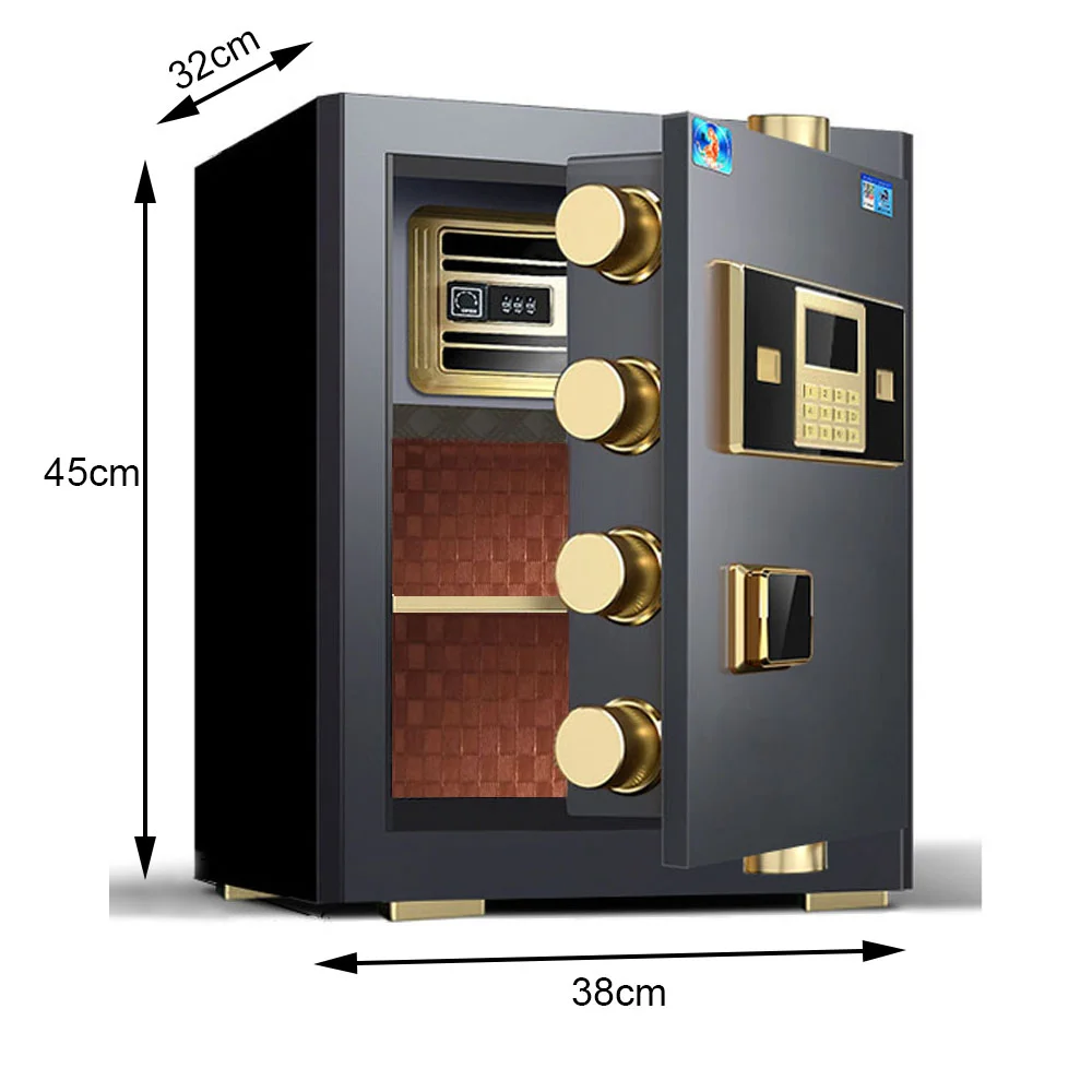 Safe box is made from solid cold rolled steel, with thickened 28 mm quadruple lock cores, which is excellent in anti-collision, anti-drilling, high temperature resistance. 78mm thickened solid door panel, laser-cut 1mm micro seam, which is the key to fireproof, anti-prying and anti-drilling