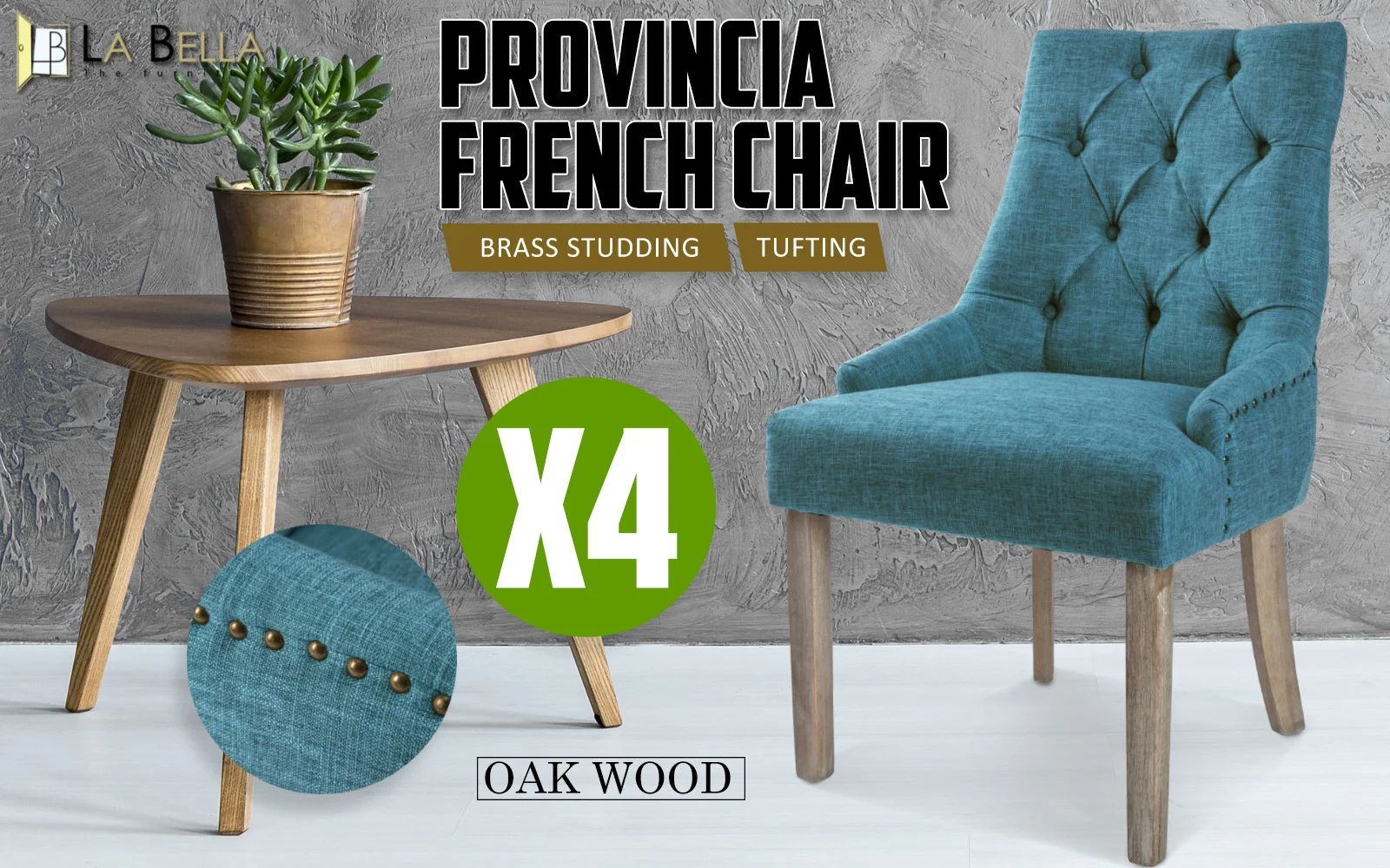 La Bella 4 Set French Provincial Dining Chair Amour Oak Fabric Studs Retro - Dark Blue