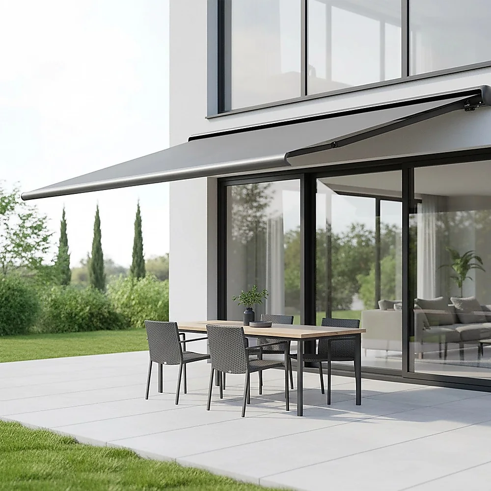 Bariloche retractable awnings are operated by wireless remote control (included) with a powerful 50 Nm tubular motor hidden within the roller tube.