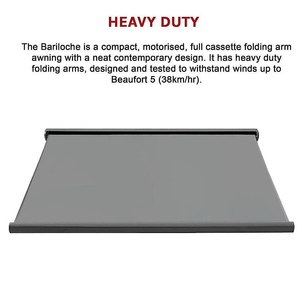 The Bariloche is a compact, motorised, full cassette folding arm awning with a neat contemporary design. It has heavy duty folding arms, designed and tested to withstand winds up to Beaufort 5 (38km/hr).