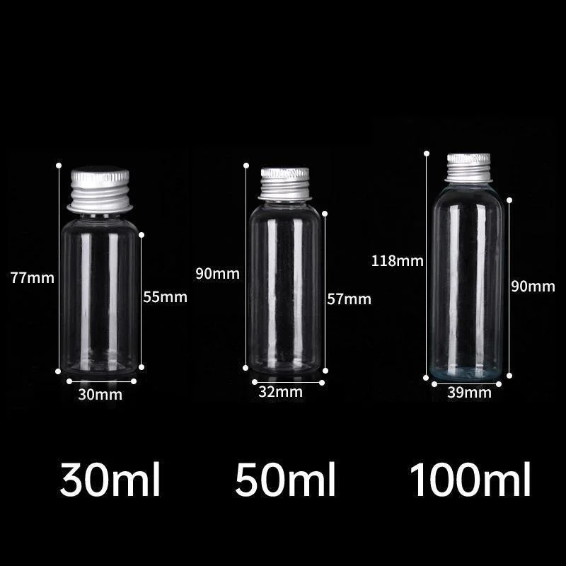 Our transparent plastic bottles with aluminum caps are the perfect solution for storing and dispensing liquids, whether for travel, personal care, or DIY projects. These bottles are crafted from high-quality PET material, ensuring durability and resistance to leaks. The sleek, clear design allows you to easily see the contents inside, while the secure screw-on aluminum caps provide an airtight seal to prevent any spillage. Available in three convenient sizes (30ml, 50ml, and 100ml), these bottles are versatile and practical, ideal for a variety of uses.