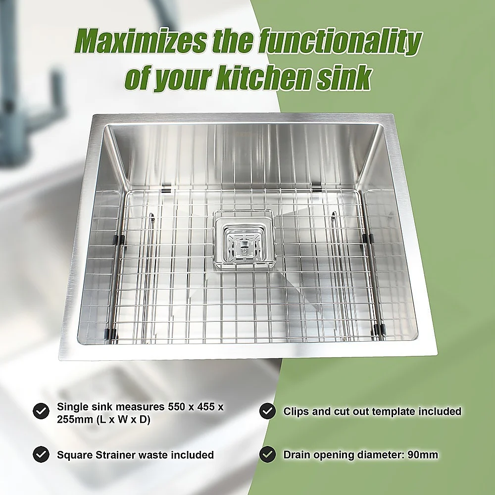 This single sink is made from 1.5mm-thick Type 304 stainless steel with a satin finish for a brilliant look that will last and last. It measures 550 x 455 x 255mm (L x W x D) with a 90mm drain opening. A Square Strainer waste is included. Installation is Undermount / Topmount-style.