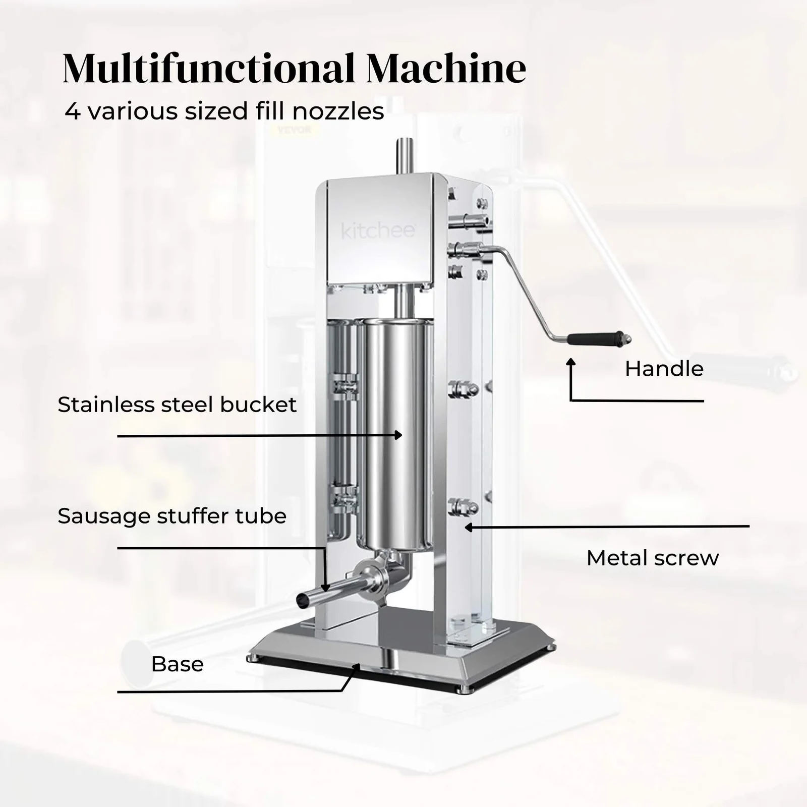 This durable filler is equipped with an ergonomic handle for convenient and effortless operating, and 4 different sized nozzles for endless types of sausages to be made. to meet the specific needs of your meat filling experience.