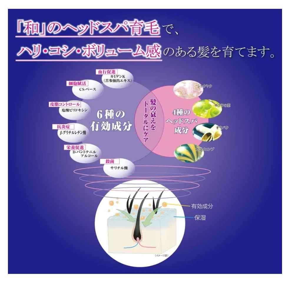 A hair growth agent for women that loosens hardened skin, adjusts moisture, and leads to soft skin. Prevents hair loss and grows healthy hair with firmness, body, and volume from the roots. Contains peonies, cherry leaves, succulents, and gagome kelp extracts (plant moisturizing extracts). It has a refreshing feel with no stickiness, and has a faint aromatic essence scent, but it doesn't leave any residue behind. Unscented.