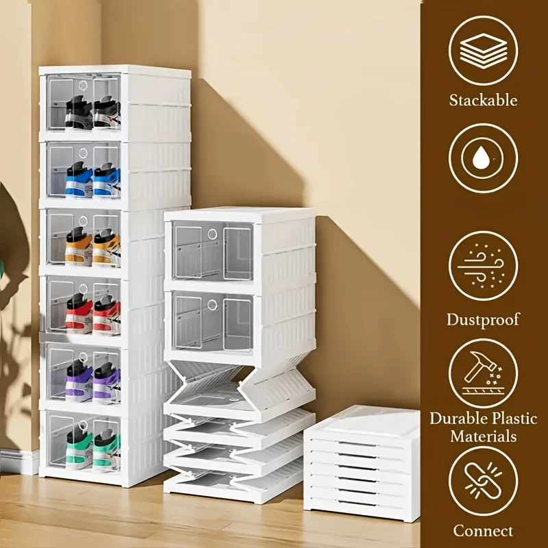 The unique **integrated folding frame** design requires no assemblyjust **pull open to use**, saving time and effort. After organizing, the boxes can be **easily stacked vertically**, significantly saving floor and cabinet space. Suitable for placement in entryways, cloakrooms, under beds, closets, and various other scenarios, it transforms a messy shoe cabinet into a tidy and organized "shoe display wall" in seconds.