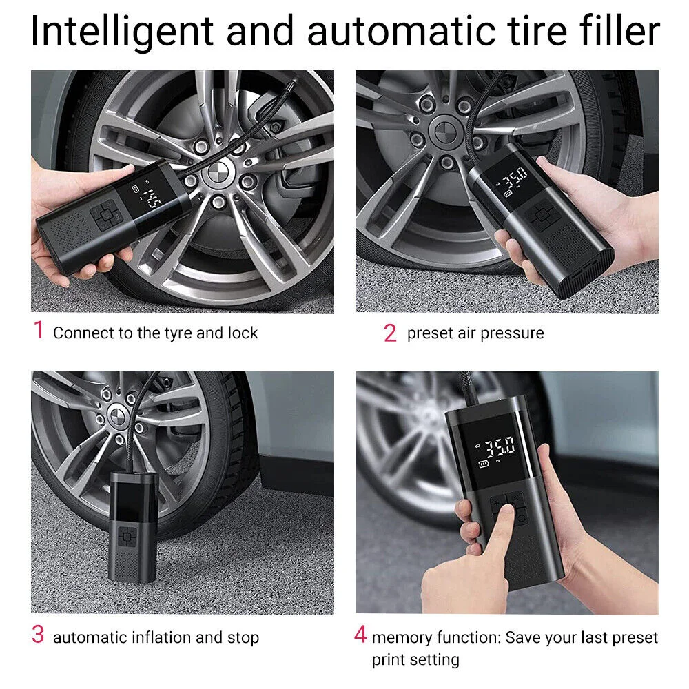 Wireless PortableThe portable air compressor is easily storage in your car. Fast inflation speed,Great Heat Dissipation, Large LCD display, Preset tire pressure, Automatic operation, Auto shut off, and Manometry Function,SOS led, come with carry bag.It is extremely easy to use.