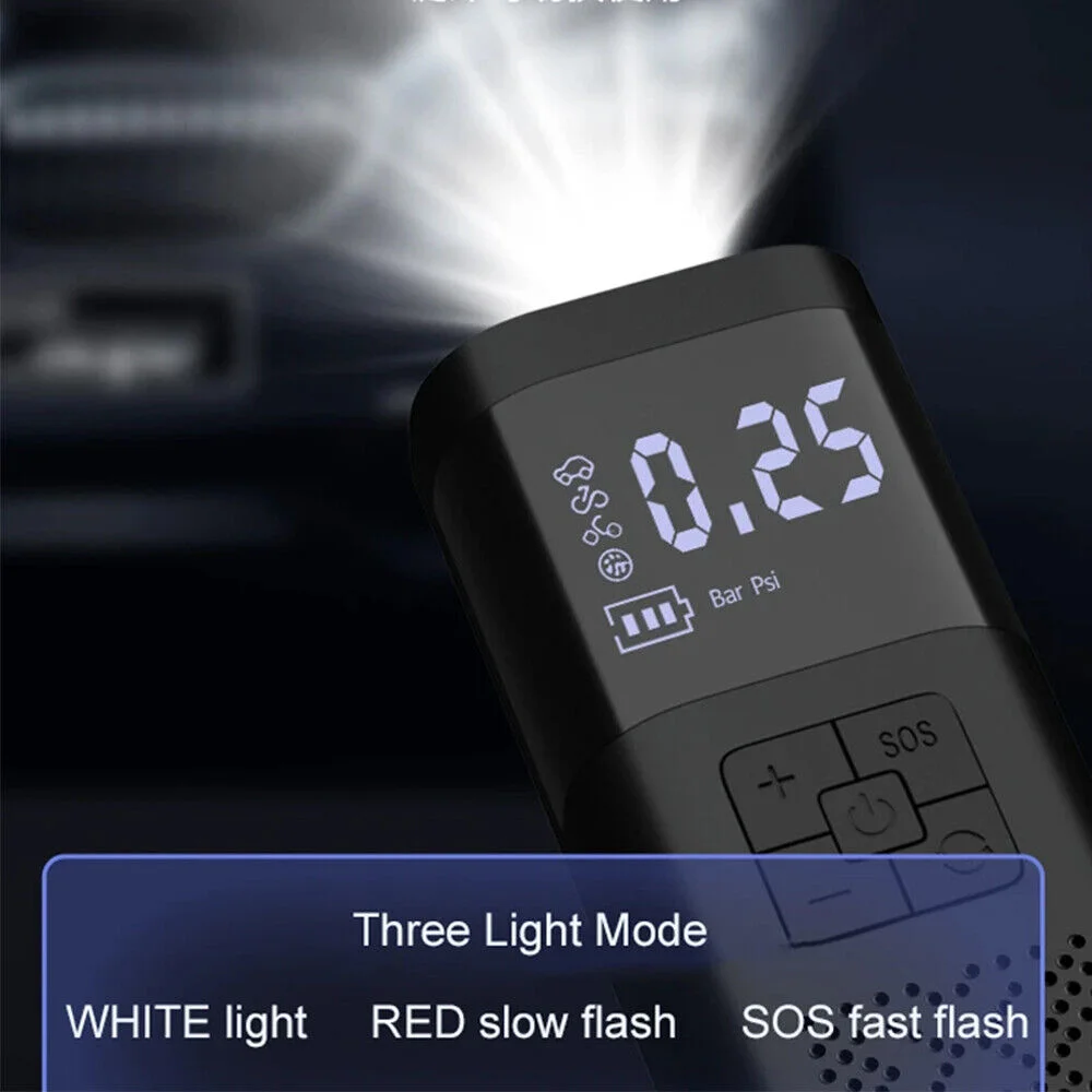 Multi-functional Car Air Pump With digital LCD display, you can easily see the pressure value.Once connection, the current tire pressure is displayed, so you can monitor accurate tire pressure at all times.The LED light can provide lighting, it helps you use in the night or dark. You can use the SOS light on the highway or emergency use to be seen quickly.
