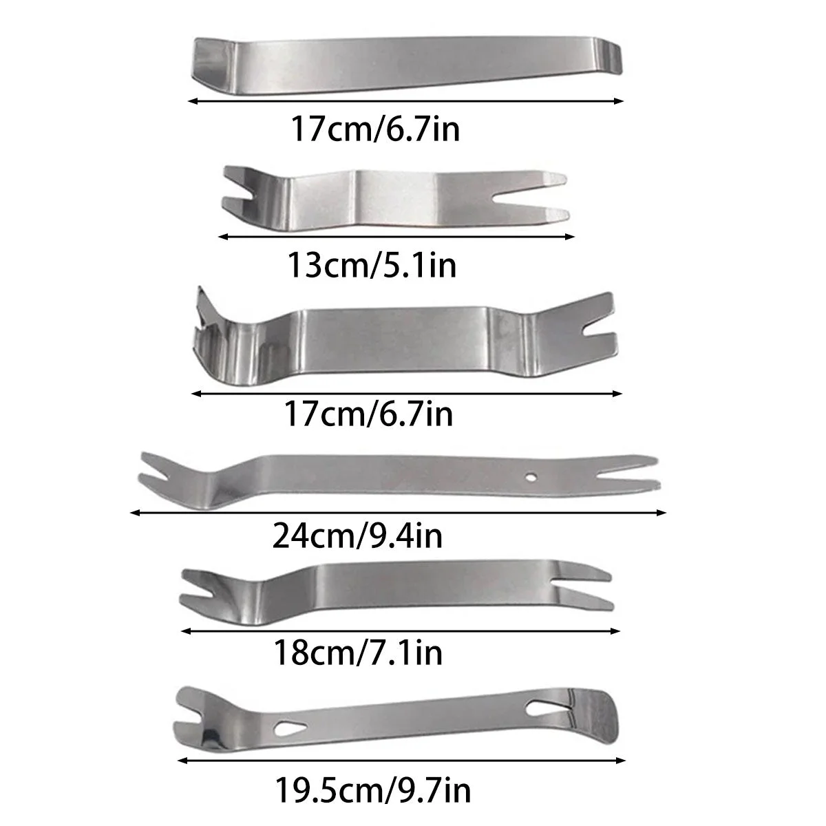 This 6-piece pry bar set is designed for car interior and audio disassembly, offering precise leverage for removing trims, fasteners, panels, and dashboards without scratching surfaces. Made of premium metal, each tool features a unique tip shape for various tasks, ensuring efficiency and safety during use.