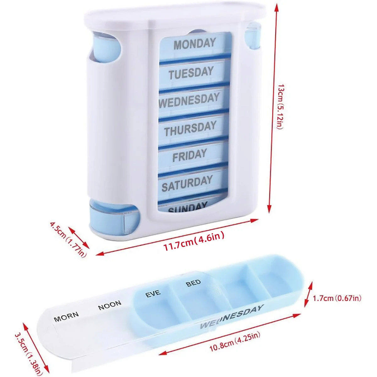 Stay on top of your medication routine with this compact weekly pill organiser featuring 28 compartments.Designed with 7 sliding trays for each day of the week, each tray includes 4 separate sections to sort doses by time of day.Made from food-grade PP material, it is safe for storing tablets, supplements, and vitamins.Its compact drawer-style structure fits neatly into cabinets, drawers, or travel bags, making it ideal for home and on-the-go use.