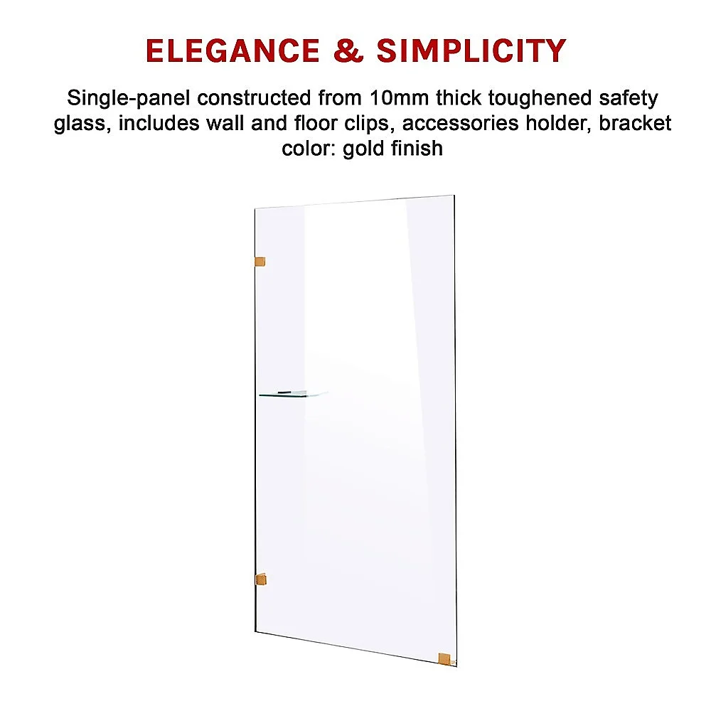 This single-panel screen is crafted from a 10mm-thick toughened safety glass. In addition to its crystal clarity, this glass is specifically designed to ensure absolute safety in the bathroom, meeting all applicable Australian Standards. Three sturdy and premium brass clips — one for the floor, two for the wall — are included for a straightforward, hassle-free installation. This panel measures 700mm wide by 2100mm high.