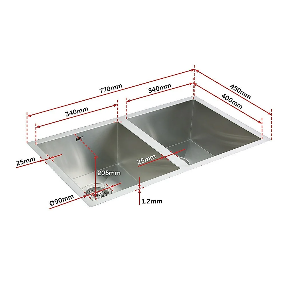 This double sink is made from hand-made 1.2mm-thick Type 304 stainless steel for a brilliant look that will last and last. It measures 770 x 450 x 190mm (L x W x D) with a 90mm drain opening. Two strainer wastes are included. Installation is either drop-in or Undermount / Topmount-style. Undermount / Topmount brackets are included along with full installation instructions.