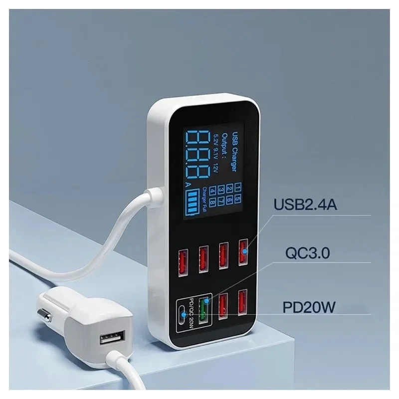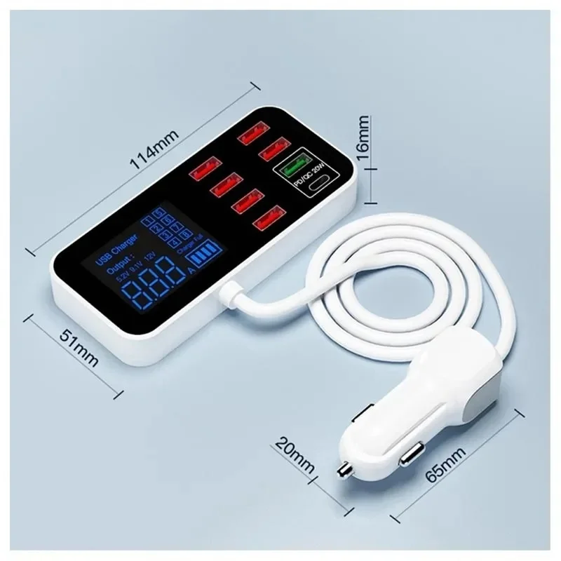 A9S+ fast car charger with nine charging ports and LCD display With seven 2.4A USB ports, one QC3.0 USB port, and one PD20W USB-C port One USB port is located on the car charger, and eight ports are located on the cable extension Qualcomm Quick Charge 3.0 and Power Delivery technologies offer fast charging for supported devices LCD display shows you the charging status, current, voltage, and USB interface usage A9S+ car charger also has a smart chip for an utterly safe charging process