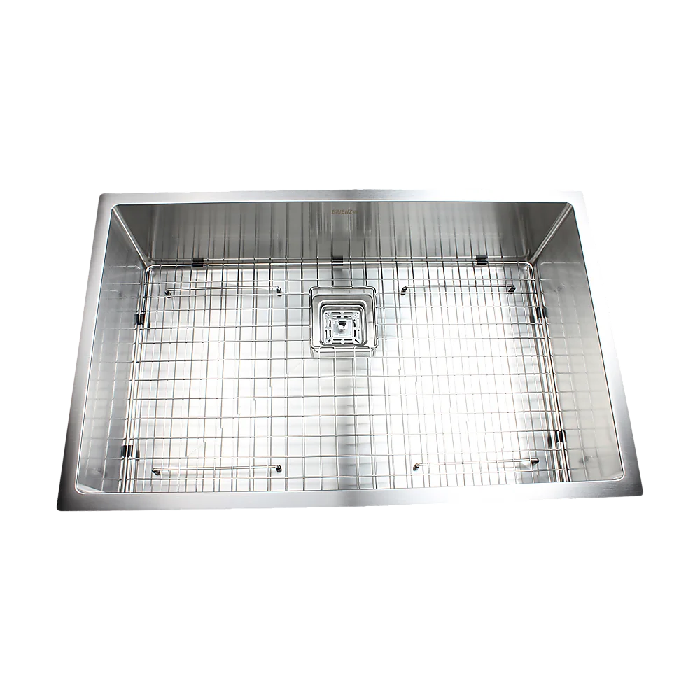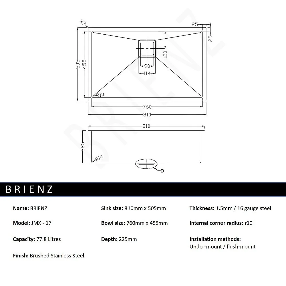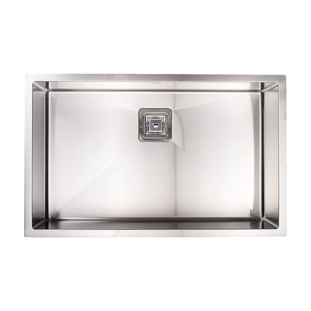 This single sink is made from 1.5mm-thick Type 304 stainless steel with a satin finish for a brilliant look that will last and last. It measures 810 x 505 x 225mm (L x W x D) with a 90mm drain opening. A Square Strainer waste is included. Installation is Undermount / Topmount-style.