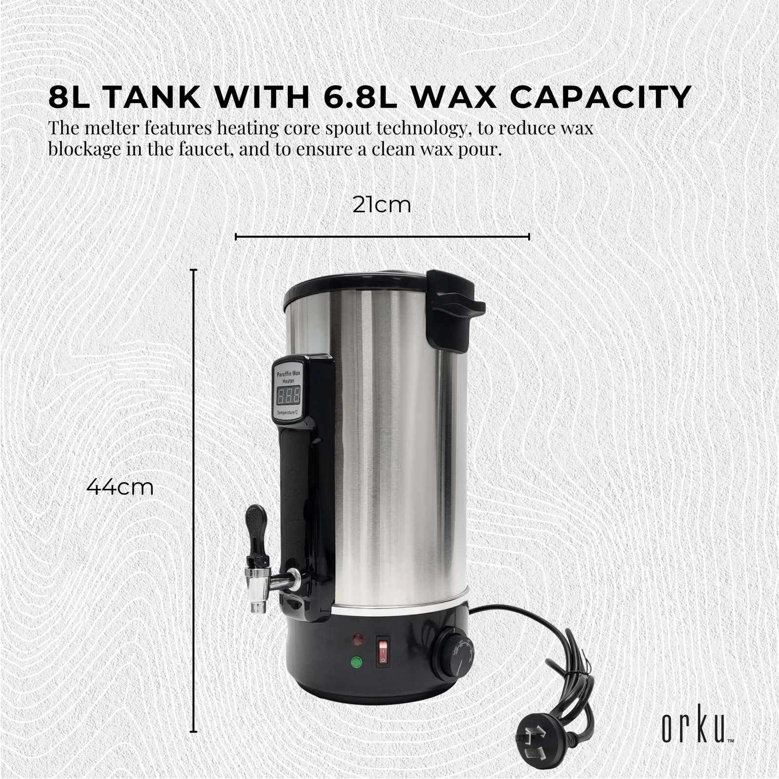This wax melting furnace is an ideal addition to your candle making operation. With an 8L capacity and adjustable temperature gauge from 30-100 degrees celsius, it can be used to melt all kinds of candle making waxes such as soy, paraffin, bees, hard, beads, and more.