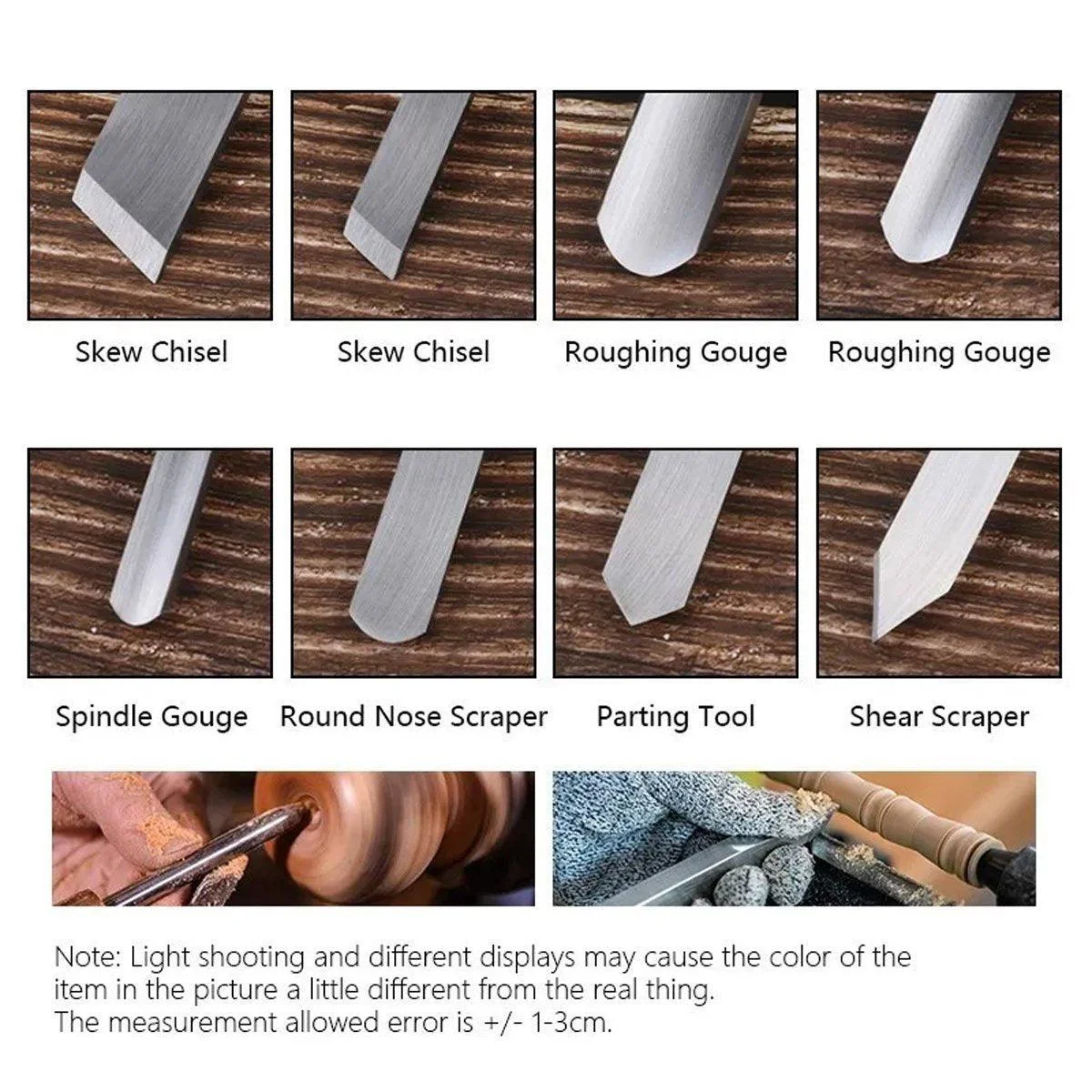 Chisel Types Included: 1" Skew, 1/2" Skew, 1/2" Spear point, 1/8" Parting Tool, 1/2" Round Nose, 1/4" Gouge, 1/2" Gouge, 3/4" Gouge
