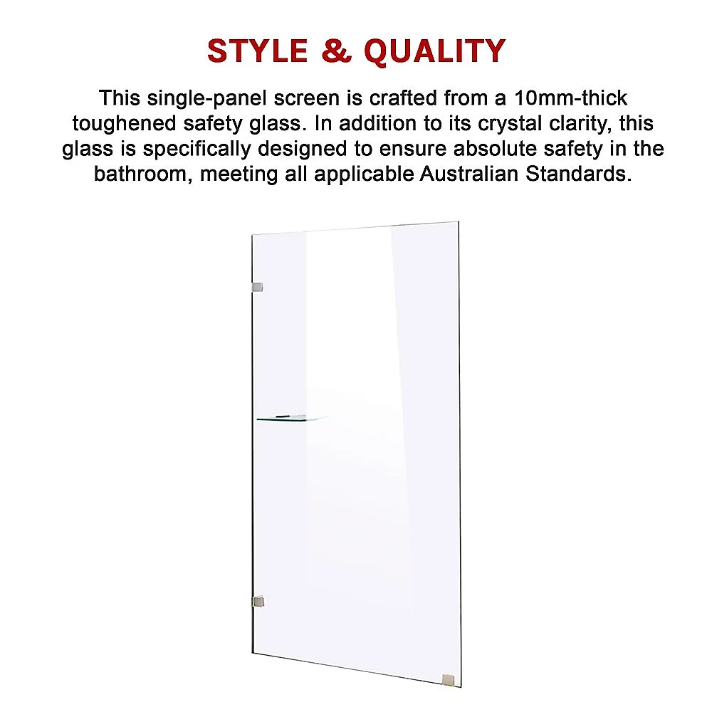 This single-panel screen is crafted from a 10mm-thick toughened safety glass. In addition to its crystal clarity, this glass is specifically designed to ensure absolute safety in the bathroom, meeting all applicable Australian Standards. Three sturdy clips — one for the floor, two for the wall — are included for a straightforward, hassle-free installation. This panel measures 900mm wide by 2000mm high.
