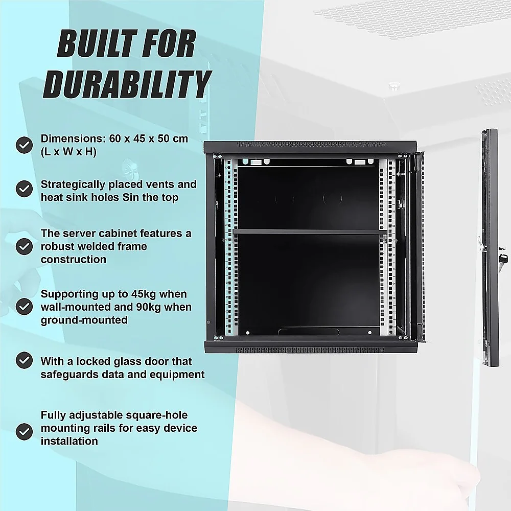 Built for durability, the server cabinet features a robust welded frame construction, supporting up to 45kg when wall-mounted and 90kg when ground-mounted. This allows you to securely house multiple devices as needed.