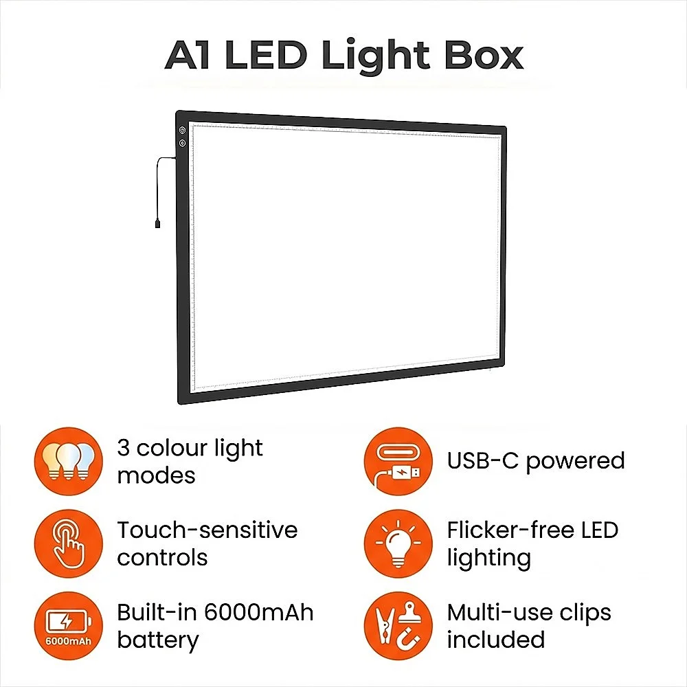 Upgrade your creative workflow with this versatile A1 LED Light Box, designed for artists, crafters, designers, and hobbyists. Featuring three colour temperatureswarm, natural, and white lightthis tracing light board adapts to any environment, helping reduce eye strain during long creative sessions.