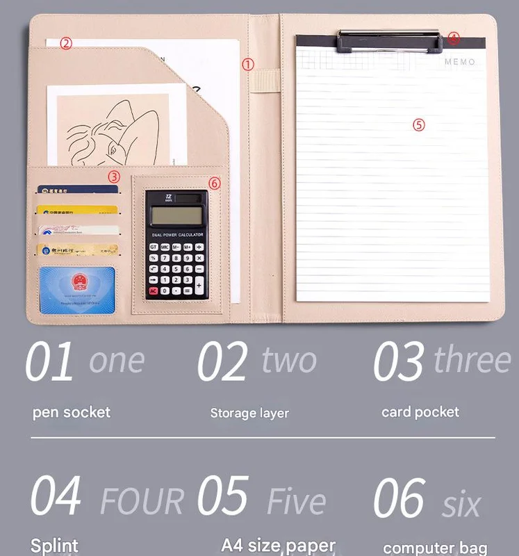 Stay organized and professional with this versatile A4 Business Portfolio, designed for storing contracts, bills, and important documents. Crafted from selected high-quality, leather-textured material, this folder exudes a premium feel. The durable spine is designed to be folded 180 degrees without deforming, ensuring longevity. Inside, you'll find a well-organized interior featuring a powerful metal ring binder, a convenient pen holder, multiple pockets for cards and notes, and an integrated 12-digit dual-power calculator. This set comes complete with 40 transparent inner sleeves to get you started. The portfolio is secured with a stylish snap-button closure, making it the perfect companion for business meetings, conferences, or daily office use.
