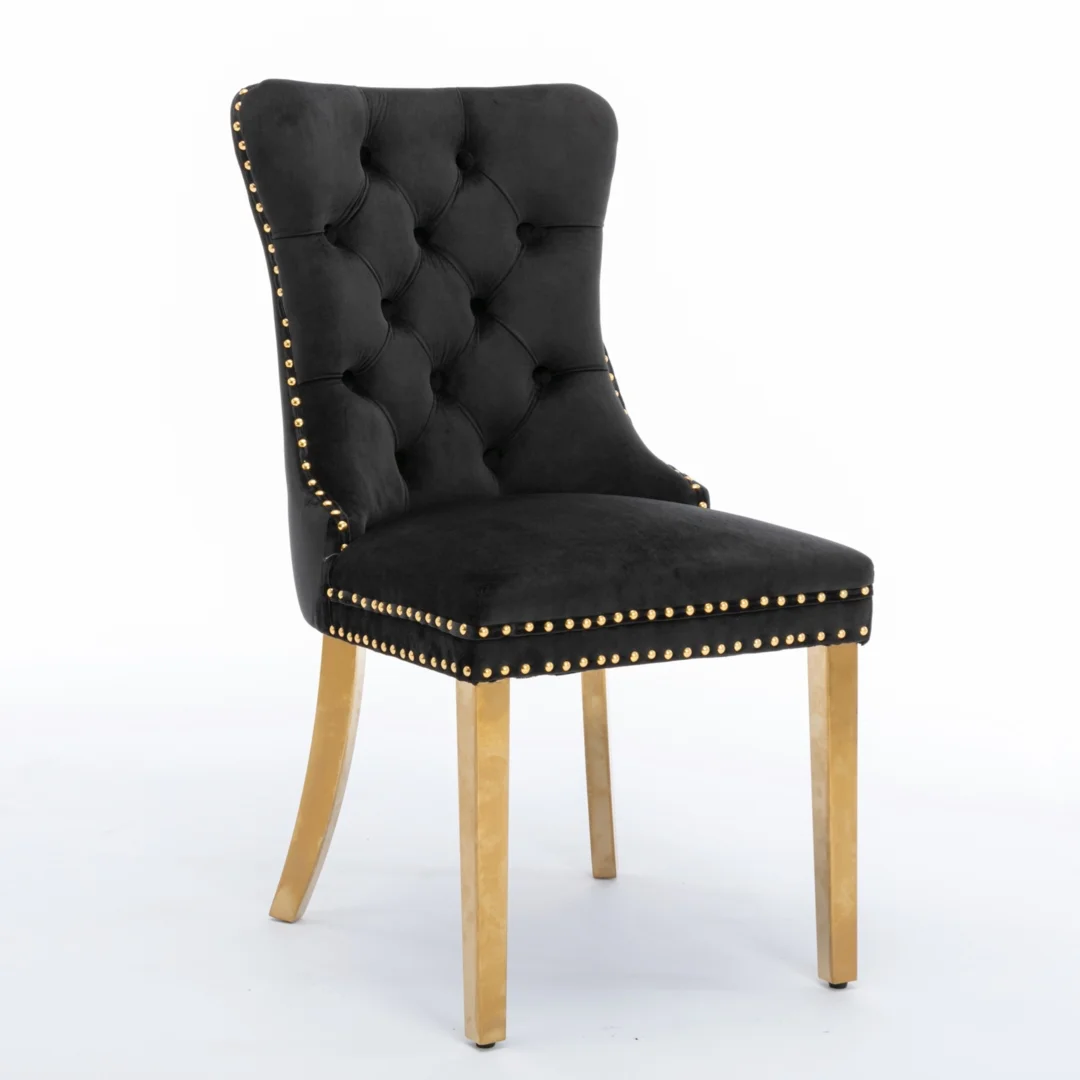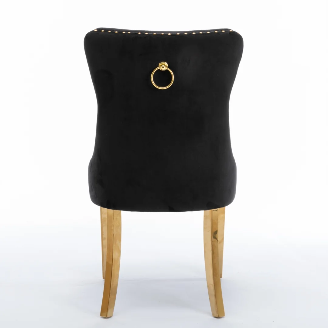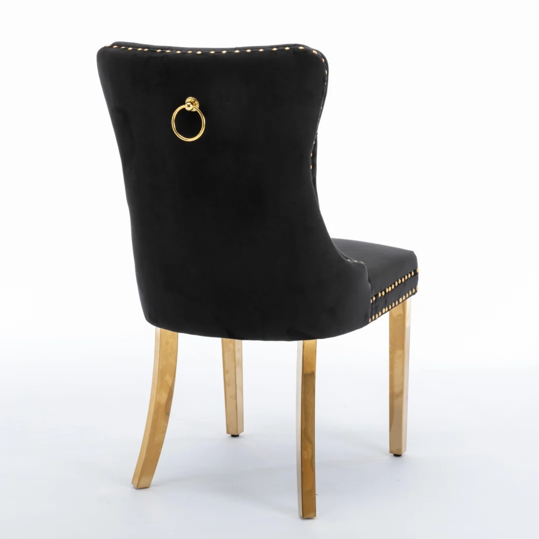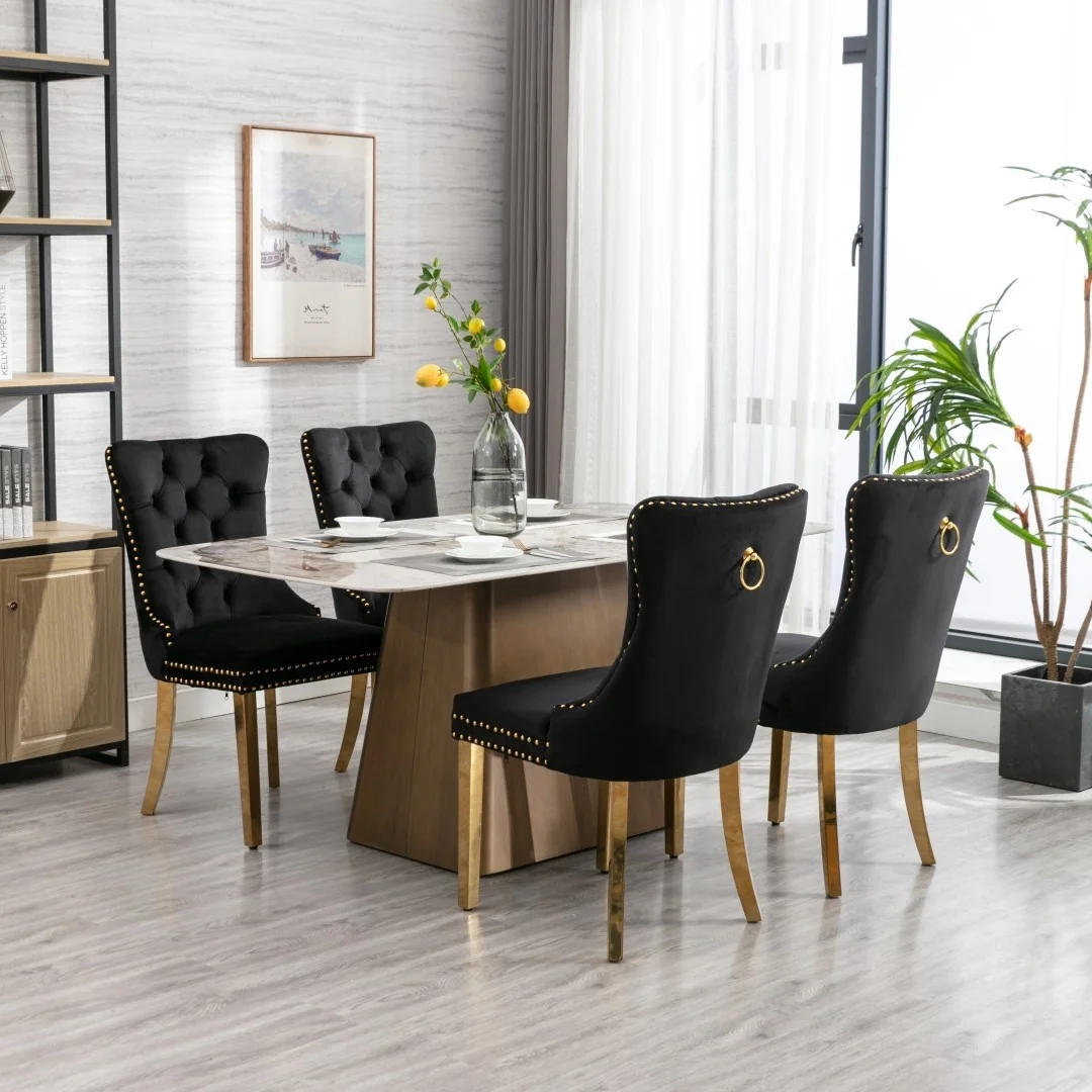 The pull-out ring on the back of the chair has a decorative effect and also helps in pulling the chair out from the table. The gold decorative studs around the cushion and backrest make the chair stand out, making it a bright spot in your home.
