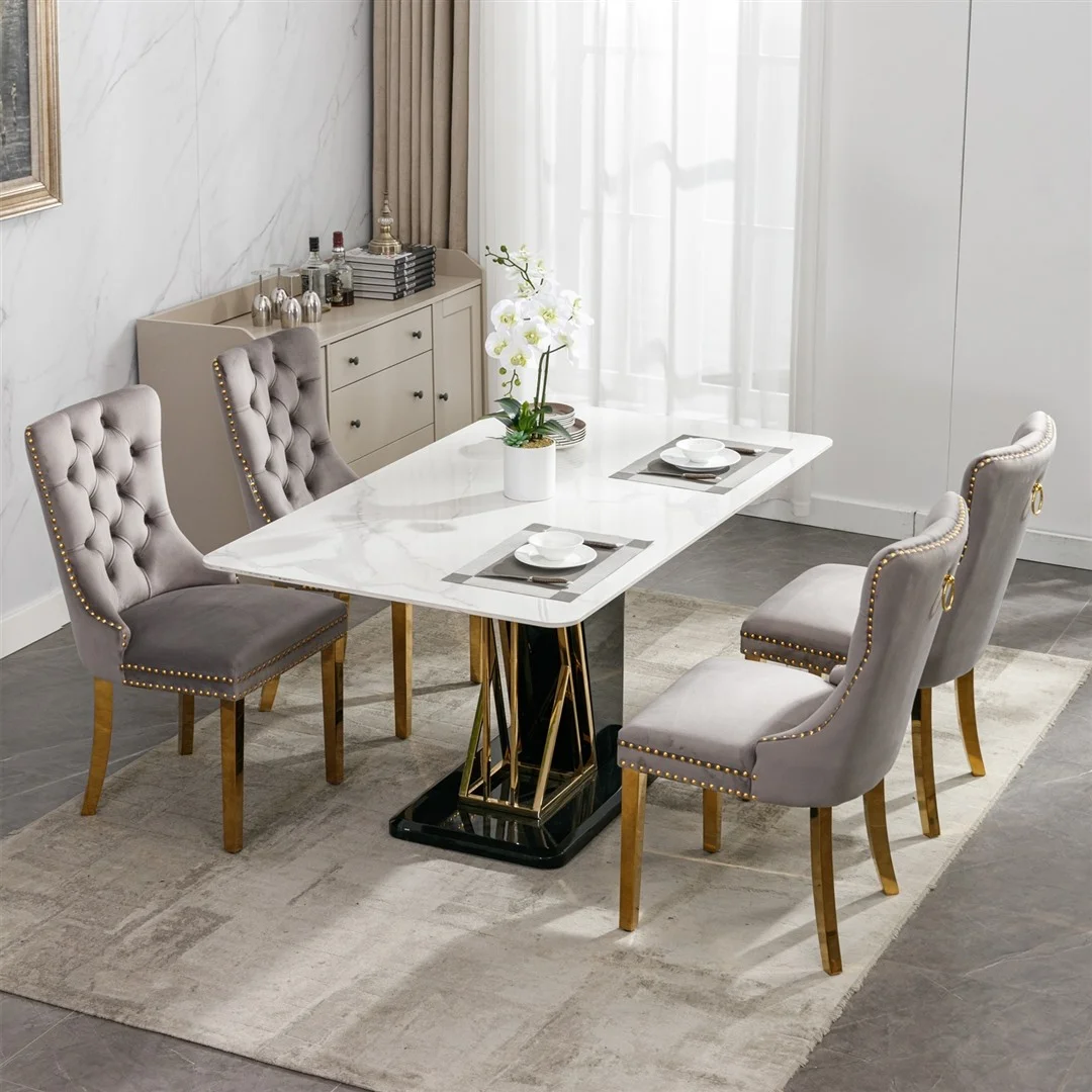 The pull-out ring on the back of the chair has a decorative effect and also helps in pulling the chair out from the table. The gold decorative studs around the cushion and backrest make the chair stand out, making it a bright spot in your home.