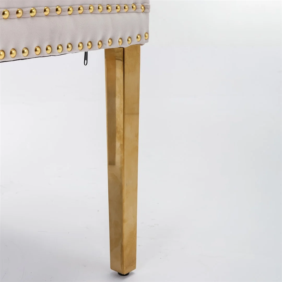 The chair's unique metal legs with gold finish, studs trim, and back pull-out ring make it a retro masterpiece, adding an extra touch of beauty to your home. These metal legs provide strong support with a weight capacity of up to 130 KGS. Small accessories at the bottom of the legs prevent sliding and scratching, ensuring the longevity of the chair.