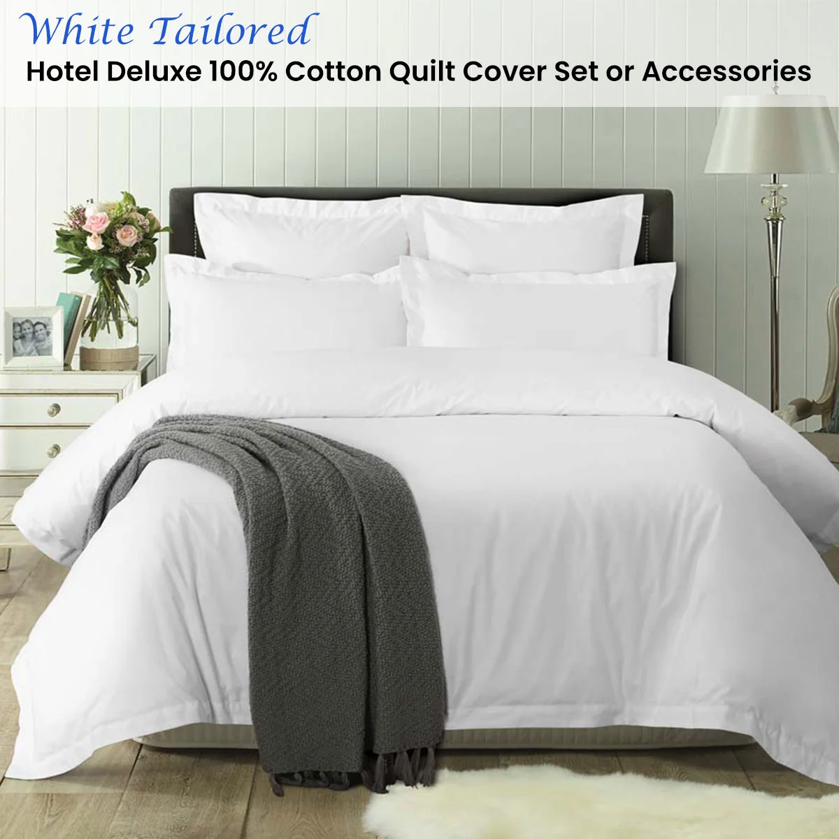 Accessorize Bedroom Collections' Luxury hotel bedding range is made from deluxe 100% Cotton. The quilt cover set is a perfect addition to your bedroom if you're after a luxurious hotel experience. The set will work with most design themes and accessories. The quilt cover and pillowcases have a beautiful 5cm flanged boarded edge and the reverse side features the same fabric. Complete the look with matching Standard and European pillowcases at extra cost.