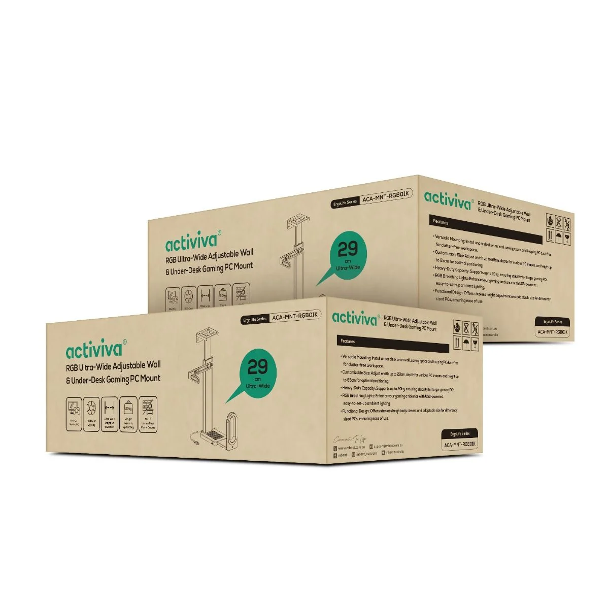 The activiva RGB Ultra-Wide Gaming PC Mount supports ultra-wide cases, perfect for gaming setups. It offers flexible mounting options under desks or on walls, ensuring optimal performance and comfort. With customizable adjustments and captivating RGB lights, it blends functionality with style for an enhanced gaming experience.