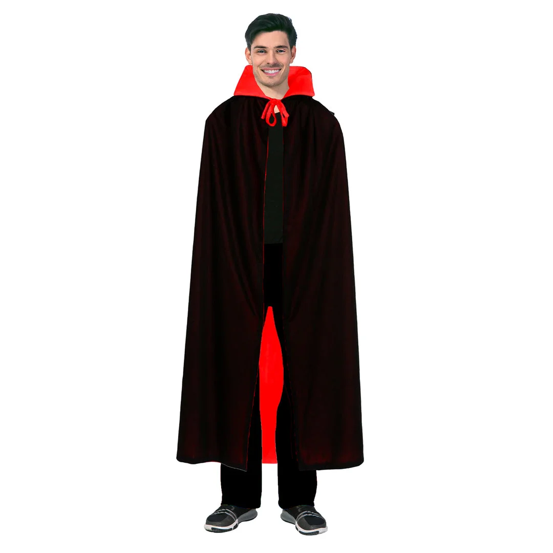 Step into the night with our Adult Vampire Collared Costume Cape and embody the classic allure of Count Dracula this Halloween. This stunning cape, with its sleek black exterior and dramatic red lining, is perfect for anyone looking to add a touch of mystery and elegance to their costume. Designed with a versatile collar that can stand up for a more imposing silhouette or lay flat for a subtler approach, this cape caters to various styles and preferences.