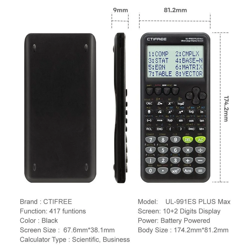 Tackle complex calculations with ease using this advanced scientific and business calculator. Featuring 417 functions and an ultra-large display, it's designed to handle everything from basic arithmetic to advanced calculus, statistics, and matrix operations. The natural textbook display shows mathematical expressions like fractions, roots, and integrals just as they appear in textbooks, making it easier to understand and input equations. Its multi-functional keyboard with durable plastic keys is designed for comfort and efficiency. Complete with a protective slide-on cover, this battery-powered calculator is a reliable tool for high school and university students, engineers, and professionals.